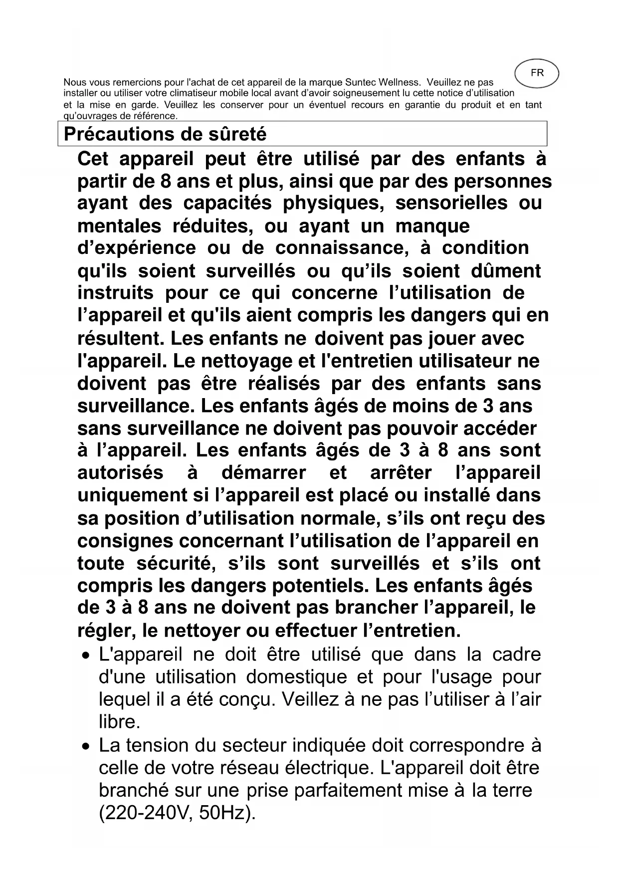 - La tension du secteur indiquée doit correspondre à celle de votre réseau électrique. L'appareil doit être branché sur une prise parfaitement mise à la terre (220-240V, 50Hz). FR• L'appareil ne doit pas être branché sur une prise défectueuse. Veuillez veiller à ce que l'appareil soit installé correctement avant la mise en service.