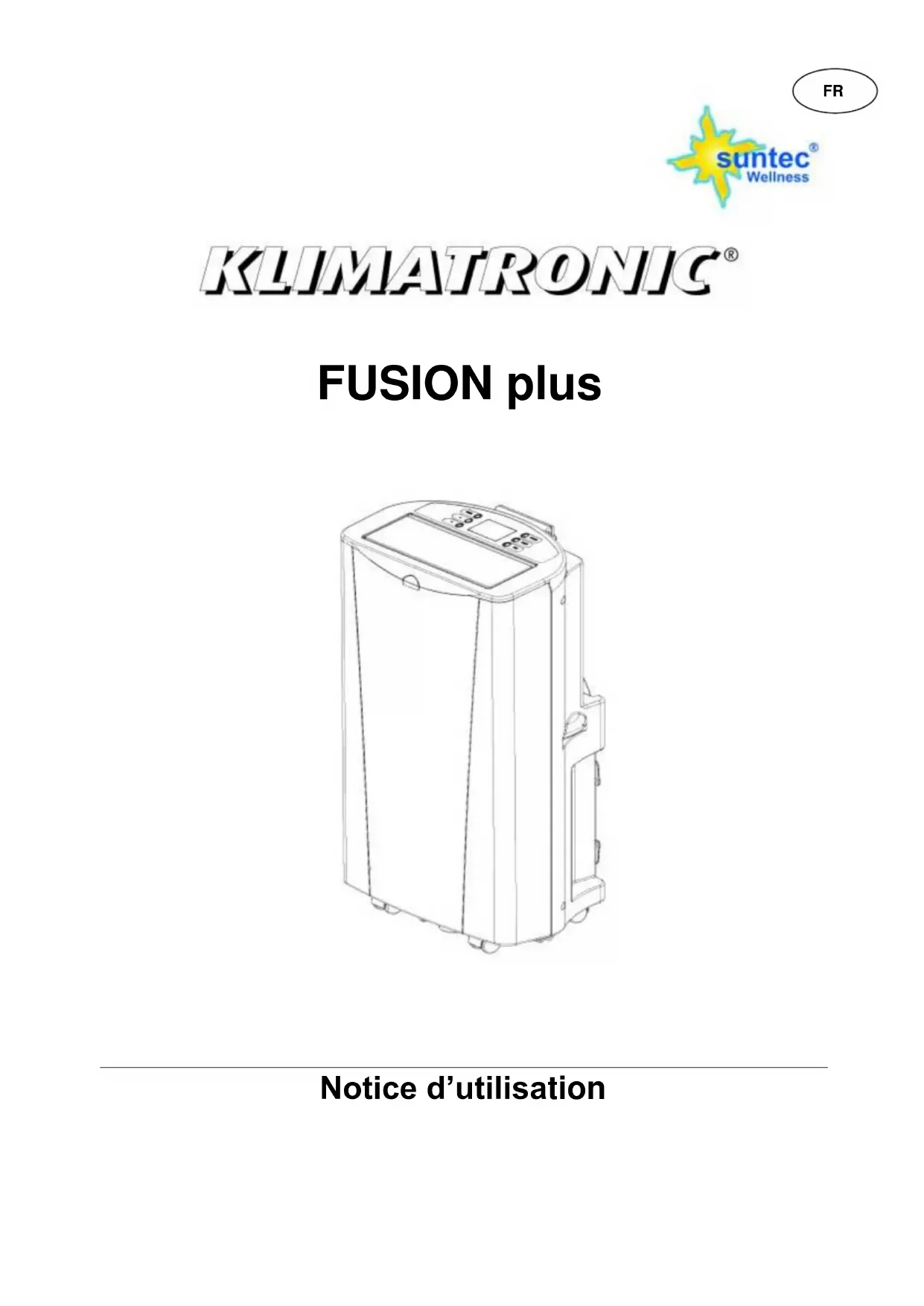 TRÈS IMPORTANT ! Veuillez ne pas installer ou utiliser le climatiseur mobile avant d'avoir soigneusement lu la notice d'utilisation. Veuillez conserver cette notice pour un éventuel recours en garantie du produit et en tant qu'ouvrage de référence.Introduction Nous vous félicitons d'avoir acheté votre appareil SUNTEC WELLNESS KLIMATRONIC ® FUSION PLUS. Votre climatiseur a été conçu et fabriqué en respectant les normes d’ingénierie moderne les plus rigoureuses. Veuillez lire attentivement la présente notice avant de brancher votre appareil FUSION PLUS sur l’alimentation, afin d'éviter tout dommage engendré par une utilisation inadéquate. Veuillez également prêter une attention particulière aux informations relatives à la sécurité. Si cet appareil FUSION PLUS devait être cédé à un tiers, la présente notice devra également lui être remise. Veuillez conserver cette notice pour toute consultation ultérieure. Nous vous remercions de votre confiance et vous souhaitons de passer d’agréables moments grâce à votre climatiseur Suntec. Consignes de sécurité avec la mise en service Cet appareil peut être utilisé par des enfants à partir de 8 ans et plus, ainsi que par des personnes ayant des capacités physiques, sensorielles ou mentales réduites, ou ayant un manque d’expérience ou de connaissance, à condition qu'ils soient surveillés ou qu’ils soient dûment instruits pour ce qui concerne l’utilisation de l’appareil et qu'ils aient compris les dangers qui en résultent. Les enfants ne doivent pas jouer avec l'appareil. Le nettoyage et l'entretien utilisateur ne doivent pas être réalisés par des enfants sans surveillance. Cet appareil est exclusivement destiné à une utilisation en intérieur. Toute autre utilisation est exclue. Lisez l'ensemble des instructions, veuillez raccorder l'appareil à des sources de courant mises à la terre. 220-240 V CA, 50 Hz. Retirez la fiche avant le montage, le démontage et avant le nettoyage de l'appareil. Exploitez toujours l'appareil sur une surface plane, pour éviter d'écoulement de l'eau. Évitez de toucher les pièces mobiles de l'appareil. Ne jamais mettre les doigts, stylos ou autres objets dans l'appareil, lorsque la fiche est branchée et surtout pas pendant le fonctionnement. N'utilisez pas la notice pour un autre appareil. L'appareil ne doit pas être utilisé, lorsque la tôle de protection n'a pas été installée conformément à la notice. Si le câble présente des dommages, il doit être remplacé par une personne qualifiée pour des raisons de sécurité, pour éviter tout risque. N'utilisez pas votre appareil avec une rallonge, si elle n'a pas été contrôlée préalablement par un professionnel. Le climatiseur doit être stocké et transporté debout, le compresseur pouvant subir des dommages irréversibles dans le cas contraire. En cas de doute, nous vous recommandons de laisser votre climatiseur au repos au moins 24 heures avant de le démarrer. Évitez de redémarrer le climatiseur au cours des 3 minutes qui suivent son arrêt, le compresseur pouvant subir des dommages dans le cas contraire. N'utilisez jamais la fiche pour faire office d'interrupteur en vue de démarrer et d'arrêter le climatiseur. Utilisez l'interrupteur ON / OFF se trouvant sur le panneau de commande, et prévu à cet effet. Placez le climatiseur portable sur une surface sèche et stable. L'appareil doit être positionné de manière à ce que le raccordement soit accessible et être installé conformément aux prescriptions locales. N'exploitez pas cet appareil dans un environnement corrosif. Nettoyez régulièrement le filtre à air pour pouvoir profiter d'une efficacité de refroidissement optimale. Les piles de la télécommande doivent être enlevées avant que celui-ci soit mis au rebut et éliminé de manière sûre. N'utilisez pas l'appareil à proximité d'une source de chaleur. N'utilisez pas l'appareil dans un environnement à risque d'aspersion d'huile ou d'eau. Évitez d'exposer l'appareil directement aux rayons du soleil. Veuillez ne jamais recouvrir l'appareil et veillez à ce que l'entrée et la sortie d'air ne soient jamais obturées. La distance minimale entre les meubles et le mur doit être de 50 cm.Astuces d'économie d'énergie Maintenez le filtre propre. Dans des conditions normales d'utilisation, le filtre doit être nettoyé tous les 30 jours environ. Il se peut qu'un nettoyage plus fréquent s'avère nécessaire, mais cela dépend de la qualité de l'air ambiant. Pour la première mise en marche, mettez la vitesse du ventilateur au maximum et le thermostat sur le refroidissement maximum. Pour obtenir un meilleur effet, nous vous recommandons d'utiliser le mode de refroidissement uniquement lorsque la température ambiante ne dépasse pas 35°C. C'est pourquoi, il peut s'avérer nécessaire de démarrer l'appareil tôt le matin, avec une température ambiante fraîche de moins de 35°C. La fonction de chauffage n'est pas recommandée lorsque la température ambiante se situe en-dessous de 7°C. DESCRIPTION DES PIÈCES DÉTACHÉES / COMPOSANTS