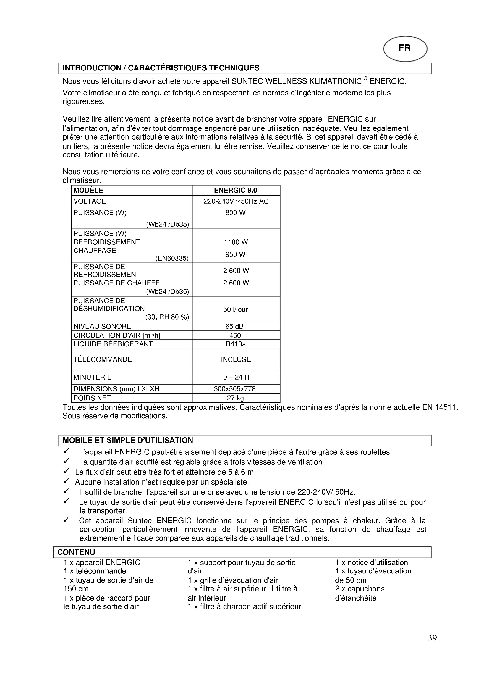 L’appareil ENERGIC peut-être aisément déplacé d'une pièce à l'autre grâce à ses roulettes. La quantité d'air soufflé est réglable grâce à trois vitesses de ventilation. Le flux d'air peut être très fort et atteindre de 5 à 6 m. Aucune installation n'est requise par un spécialiste. Il suffit de brancher l'appareil sur une prise avec une tension de 220-240V/ 50Hz. Le tuyau de sortie d’air peut être conservé dans l’appareil ENERGIC lorsqu'il n'est pas utilisé ou pour le transporter. Cet appareil Suntec ENERGIC fonctionne sur le principe des pompes à chaleur. Grâce à la conception particulièrement innovante de l’appareil ENERGIC, sa fonction de chauffage est extrêmement efficace comparée aux appareils de chauffage traditionnels. CONTENU 1 x appareil ENERGIC 1 x télécommande 1 x tuyau de sortie d’air de 150 cm 1 x pièce de raccord pour le tuyau de sortie d’air 1 x support pour tuyau de sortie d’air 1 x grille d’évacuation d'air 1 x filtre à air supérieur, 1 filtre à air inférieur 1 x filtre à charbon actif supérieur 1 x notice d’utilisation 1 x tuyau d’évacuation de 50 cm 2 x capuchons d’étanchéité FR40