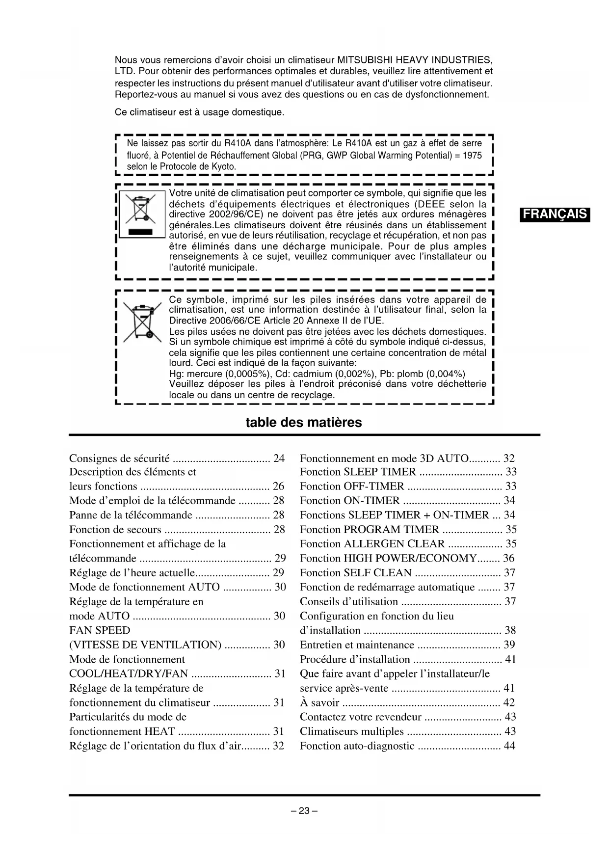 - Nous vous remercions d’avoir choisi un climatiseur MITSUBISHI HEAVY INDUSTRIES, LTD. Pour obtenir des performances optimales et durables, veuillez lire attentivement et respecter les instructions du présent manuel d’utilisateur avant d'utiliser votre climatiseur. Reportez-vous au manuel si vous avez des questions ou en cas de dysfonctionnement. Ce climatiseur est à usage domestique. table des matières FRANÇAIS Ne laissez pas sortir du R410A dans l’atmosphère: Le R410A est un gaz à effet de serre fluoré, à Potentiel de Réchauffement Global (PRG, GWP Global Warming Potential) = 1975 selon le Protocole de Kyoto. Votre unité de climatisation peut comporter ce symbole, qui signifie que les déchets d’équipements électriques et électroniques (DEEE selon la directive 2002/96/CE) ne doivent pas être jetés aux ordures ménagères générales.Les climatiseurs doivent être réusinés dans un établissement autorisé, en vue de leurs réutilisation, recyclage et récupération, et non pas être éliminés dans une décharge municipale. Pour de plus amples renseignements à ce sujet, veuillez communiquer avec l’installateur ou l’autorité municipale. Ce symbole, imprimé sur les piles insérées dans votre appareil de climatisation, est une information destinée à l’utilisateur final, selon la Directive 2006/66/CE Article 20 Annexe II de l’UE. Les piles usées ne doivent pas être jetées avec les déchets domestiques. Si un symbole chimique est imprimé à côté du symbole indiqué ci-dessus, cela signifie que les piles contiennent une certaine concentration de métal lourd. Ceci est indiqué de la façon suivante: Hg: mercure (0,0005%), Cd: cadmium (0,002%), Pb: plomb (0,004%) Veuillez déposer les piles à l’endroit préconisé dans votre déchetterie locale ou dans un centre de recyclage. Consignes de sécurité p. 24