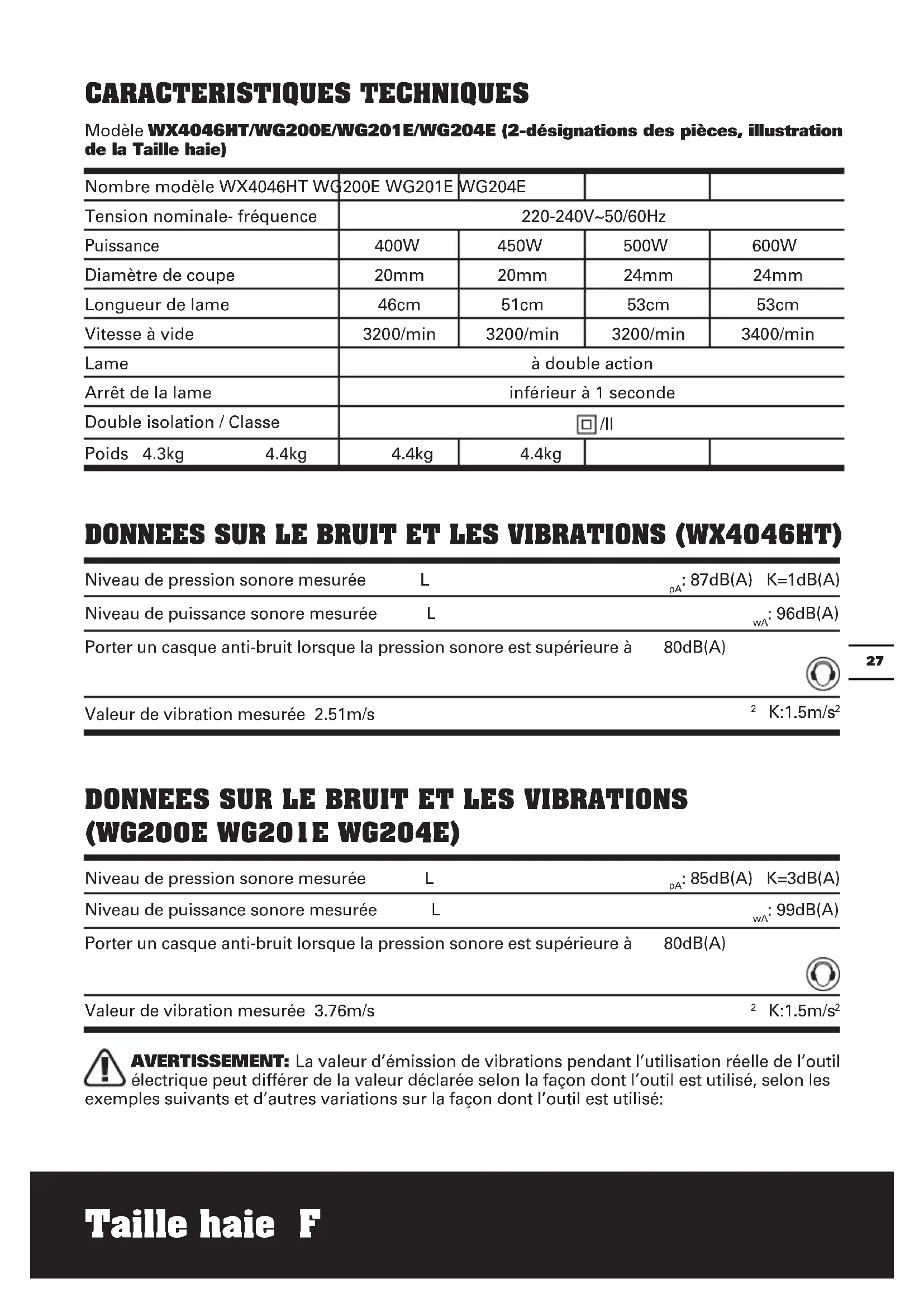 CARACTERISTIQUES TECHnIQUES Modèle WX4046HT/WG200E/WG201E/WG204E (2-désignations des pièces, illustration de la Taille haie) DOnnEES SUR LE BRUIT ET LES VIBRATIOnS (WX4046HT) Niveau de pression sonore mesurée L