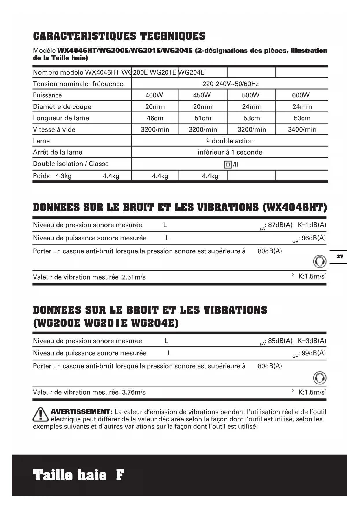 électrique peut différer de la valeur déclarée selon la façon dont l’outil est utilisé, selon les exemples suivants et d’autres variations sur la façon dont l’outil est utilisé: Nombre modèle WX4046HT WG200E WG201E WG204E Tension nominale- fréquence 220-240V~50/60Hz Puissance 400W 450W 500W 600W Diamètre de coupe 20mm 20mm 24mm 24mm Longueur de lame 46cm 51cm 53cm 53cm Vitesse à vide 3200/min 3200/min 3200/min 3400/min Lame à double action Arrêt de la lame inférieur à 1 seconde Double isolation / Classe /II Poids 4.3kg 4.4kg 4.4kg 4.4kgTaille haie F
