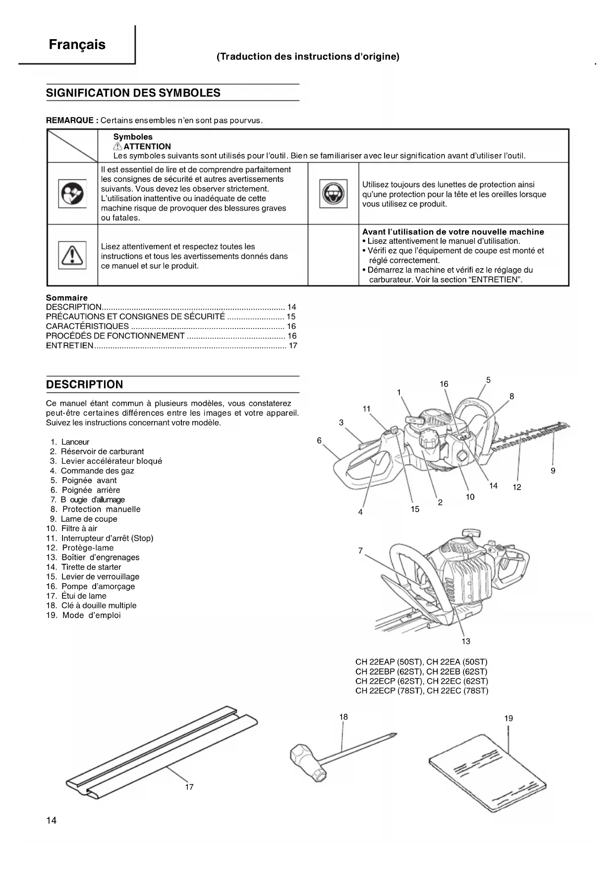 (Traduction des instructions d'origine) 000BookCH22EAP(50ST)WENE.indb14000BookCH22EAP(50ST)WENE.indb14 2012/01/1610:11:422012/01/1610:11:4215 Français PRÉCAUTIONS ET CONSIGNES DE SÉCURITÉ À conserver pour référence future. CE TAILLE-HAIES EST SUSCEPTIBLE DE CAUSER DES ACCIDENTS CORPORELS GRAVES. Lisez attentivement les instructions pour permettre une manipulation, une préparation, une maintenance, un démarrage et un arrêt corrects du taille-haies. Familiarisez-vous avec les contrôles et avec l’utilisation correcte du taille-haies. Sécurité de l’utilisateur ○ Portez toujours une visière et des lunettes de protection. ○ Portez toujours un pantalon, des chaussures et des gants de sécurité. Evitez les vêtements amples, les shorts, les sandales et les pieds nus. Veillez à ce que vos cheveux ne descendent pas au-dessous des épaules. ○ Utilisez cette machine uniquement si vous êtes en pleine possession de vos moyens physiques. Evitez strictement la consommation d’alcool, de drogue ou de médicaments. ○ Ne laissez jamais un enfant ou une personne inexpérimentée se servir de ces machines. ○ Faites attention aux câbles électriques en surplomb. ○ Portez un dispositif de protection auditif contre le bruit. ○ Ne mettez jamais le moteur en marche dans un local clos, les gaz d’échappement étant toxiques. ○ Nettoyez les poignées de toute trace d’huile ou de carburant. ○ N’approchez jamais les mains du guide-chaîne et de la chaîne. ○ N’attrapez jamais et ne tenez jamais la machine par l’extrémité du guide-chaîne. ○ Après l’arrêt de la tronçonneuse, attendez l’arrêt complet de la chaîne de coupe avant de poser la machine. ○ Lors d’une utilisation prolongée, veillez à oratiquer des pauses régulières afi n d’éviter des troubles éventuels provoqués par les vibrations. ○ Si le mécanisme de coupe heurte un objet étranger ou si le taille-haies commence à émettre des bruits ou des vibrations anormaux, coupez l’alimentation et laissez le taille-haies s’arrêter. Débranchez le fi l de la bougie de la bougie et procédez de la façon suivante :
