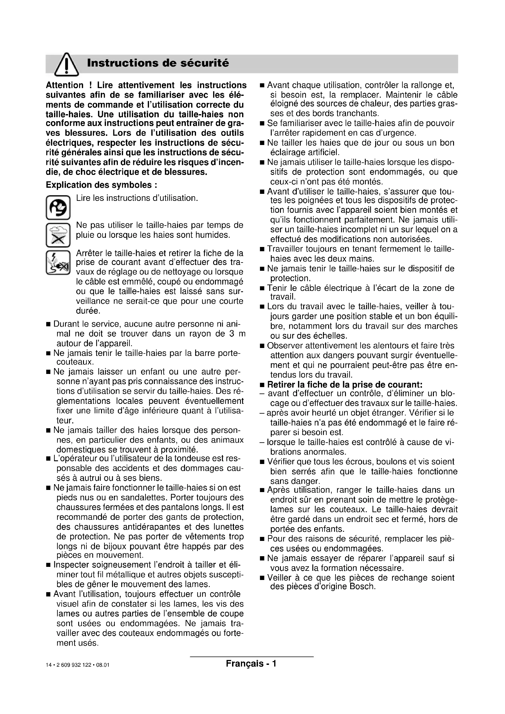 MENT. 15 • 2 609 932 122 • 08.01Français - 3 Sécurité relative au système électrique Pour des raisons de sécurité, la machine est équi- pée d’une double isolation et ne nécessite pas de prise de terre. La tension de fonctionnement est de 230 V en courant alternatif, 50 Hz. N’utiliser qu’une rallonge électrique homologuée. Pour plus de ren- seignements, contacter le service après-vente auto- risé. Seules les rallonges de type H05VV-F ou H05RN-F doivent être utilisées. Pour plus de sécurité, il est recommandé d’utiliser un disjoncteur différentiel avec un courant de défaut de 30 mA maximum. Avant chaque utilisation de la machine, contrôler ce disjoncteur différentiel. Remarque concernant les produits non commercia- lisés en GB: ATTENTION : Pour votre propre sécu- rité, il est nécessaire que la fiche 6 montée sur la machine soit raccordée à la rallonge 8 conformé- ment à la figure. Le dispositif de couplage de la rallonge doit être pro- tégé des projections d’eau, être en caoutchouc ou être recouvert de caoutchouc. La rallonge doit être utilisée avec un serre-câble. Contrôler régulièrement le câble d’alimentation afin de détecter des dommages éventuels. Il ne doit être utilisé que s’il est en bon état. Si le câble d’alimentation est détérioré, il ne doit être réparé que dans un atelier agréé Bosch. Mise en fonctionnement: Appuyer sur l’interrupteur Marche/Arrêt de la poi- gnée arrière 5 et le maintenir dans cette position. Appuyer sur le levier interrupteur 3. Arrêter: Relâcher le levier interrupteur 3 et l’interrupteur Mar- che/Arrêt 5. Tenir le taille-haies avec les deux mains et en le tenant suffisamment écarté du corps. Veiller à toujours garder une position sta- ble. Poser le câble de rallonge par-dessus l’épaule et faire attention à ce qu’il reste toujours derrière lors du travail. Ne jamais poser le câble par-dessus la haie, il risque d’être happé par les couteaux. Il est possible de couper des branches d’une épais- seur allant jusqu’à 24 mm au maximum. Afin d’ap- procher les branches des couteaux, avancer le taille-haies de manière régulière sur la ligne de coupe. La barre porte-couteaux munie de lames des deux côtés permet de tailler dans les deux sens ou d’effectuer des mouvements pendulaires de va-et- vient. Couper d’abord les côtés latéraux de la haie, puis le bord supérieur. Afin d’obtenir un aspect impeccable, nous vous re- commandons de tailler dans le sens de croissance de bas en haut. Au cas où l’on taillerait de haut en bas, les branches plus minces se déplaceraient vers l’extérieur, laissant des trous ou des endroits moins touffus. Afin de tailler finalement le bord supérieur de ma- nière régulière, tendre un fil sur toute la longueur de la haie à la hauteur souhaitée. Veiller à ne pas couper de corps étrangers tels que des fils métalliques qui risqueraient d’endommager les couteaux ou l’entraînement. Saison pour tailler les haies : – Il est recommandé de tailler les haies à feuilles en juin et en octobre. – les haies en conifères en avril et en août. – couper les conifères et autres haies qui poussent vite à partir de mai toutes les 6 semaines. – La taille des haies devrait être effectuée dans une forme conforme à la figure. Avant d’effectuer tous travaux de mainte- nance, débrancher la fiche de la prise de courant. Remarque: afin d’assurer une utilisation longue et fiable de la tondeuse, procéder à intervalles régu- liers aux travaux d’entretien suivants. Contrôler le taille-haies à intervalles réguliers afin de détecter des défauts visibles tels qu’une barre porte- couteaux détachée, décrochée ou endommagée, des raccordements détachés ou des pièces usées ou endommagées. Vérifier que les couvercles et les dispositifs de pro- tection ne soient pas endommagés et qu’ils soient correctement montés. Les travaux d’entretien ou de réparation nécessaires doivent être effectués avant d’utiliser le taille-haies. Si, malgré tous les soins apportés à la fabrication et au contrôle du taille-haies, celui-ci devait avoir un défaut, la réparation ne doit être confiée qu’à une station de service après-vente agréée pour outillage Bosch. Pour toute demande de renseignements ou com- mande de pièces de rechange, nous préciser impé- rativement le numéro de référence à dix chiffres de la machine. Mise en fonctionnement Travailler avec le taille-haies