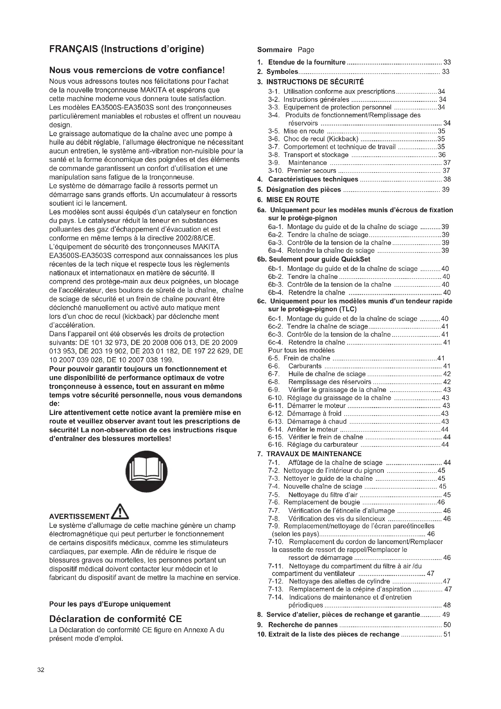 Use only original MAKITA parts. For repairs and replacement of other parts, see your MAKITA service centre. EA3500S, 3501S EA3502S, 3503S Pos. Denomination 1 Sprocket nose bar 3/8”, 30 cm, 1.3 mm (12”) Sprocket nose bar 3/8”, 35 cm, 1.3 mm (14”) Sprocket nose bar 3/8”, 40 cm, 1.3 mm (16”) 2 Saw chain 3/8” for 30 cm, 1.3 mm Saw chain 3/8” for 35 cm, 1.3 mm Saw chain 3/8” for 40 cm, 1.3 mm 1 Sprocket nose bar 3/8”, 30 cm, 1.1 mm (12”) Sprocket nose bar 3/8”, 35 cm, 1.1 mm (14”) 2 Saw chain 3/8” for 30 cm, 1.1 mm Saw chain 3/8” for 35 cm, 1.1 mm 1 Sprocket nose bar 3/8”, 30 cm, 1.3 mm (12”) Sprocket nose bar 3/8”, 35 cm, 1.3 mm (14”) Sprocket nose bar 3/8”, 40 cm, 1.3 mm (16”) 2 Saw chain 3/8” for 30 cm, 1.3 mm Saw chain 3/8” for 35 cm, 1.3 mm Saw chain 3/8” for 40 cm, 1.3 mm 1 Sprocket nose bar 3/8”, 30 cm, 1.1 mm (12”) Sprocket nose bar 3/8”, 35 cm, 1.1 mm (14”) 2 Saw chain 3/8” for 30 cm, 1.1 mm Saw chain 3/8” for 35 cm, 1.1 mm 3 Chain protector for 30-35 cm (3/8”) Chain protector for 40 cm (3/8”) 4 Universal wrench SW 16/13 6 Carburetor screwdriver 7 Suction head 8 Fuel tank cap, cpl. 9 O-Ring 29.3 x 3.6 mm 10 Return spring pack, complete 11 Spring 12 Driver 13 Starter cable 3 x 900 mm 14 Spark plug 15 Oil tank cap, cpl. 16 O-Ring 29.3 x 3.6 mm 17 Air lter 18 Sprocket guard, cpl. Sprocket guard (with fast tensioner), complete 19 Hexagonal nut M8 20 Clutch drum cpl. 3/8”, 6-tooth 21 Shim washer 22 Circlip 23 Spark arrester screen (country specic) Accessories (not delivered with the chain saw) 25 Chain gauge 26 File handle 27 Round le, dia. 4.5 mm 28 Round le, dia. 4.0 mm 29 Flat le 30 File holder (with round le dia. 4.5 mm) 31 File holder (with round le dia. 4.0 mm) 32 Offset screwdriver - Combined can (for 5l fuel, 3l chain oil)32 FRANÇAIS (Instructions d’origine) Nous vous remercions de votre conance! Nous vous adressons toutes nos félicitations pour l’achat de la nouvelle tronçonneuse MAKITA et espérons que cette machine moderne vous donnera toute satisfaction. Les modèles EA3500S-EA3503S sont des tronçonneuses particulièrement maniables et robustes et offrent un nouveau design. Le graissage automatique de la chaîne avec une pompe à huile au débit réglable, l’allumage électronique ne nécessitant aucun entretien, le système anti-vibration non-nuisible pour la santé et la forme économique des poignées et des éléments de commande garantissent un confort d’utilisation et une manipulation sans fatigue de la tronçonneuse. Le système de démarrage facile à ressorts permet un démarrage sans grands efforts. Un accumulateur à ressorts soutient ici le lancement. Les modèles sont aussi équipés d’un catalyseur en fonction du pays. Le catalyseur réduit la teneur en substances polluantes des gaz d’échappement d’évacuation et est conforme en même temps à la directive 2002/88/CE. L’équipement de sécurité des tronçonneuses MAKITA EA3500S-EA3503S correspond aux connaissances les plus récentes de la tech nique et respecte tous les règlements nationaux et internationaux en matière de sécurité. Il comprend des protège-main aux deux poignées, un blocage de l’accélérateur, des boulons de sûreté de la chaîne, chaîne de sciage de sécurité et un frein de chaîne pouvant être déclenché manuellement ou activé auto matique ment lors d’un choc de recul (kickback) par déclenche ment d’accélération. Dans l’appareil ont été observés les droits de protection suivants: DE 101 32 973, DE 20 2008 006 013, DE 20 2009 013 953, DE 203 19 902, DE 203 01 182, DE 197 22 629, DE 10 2007 039 028, DE 10 2007 038 199. Pour pouvoir garantir toujours un fonctionnement et une disponibilité de performance optimaux de votre tronçonneuse à essence, tout en assurant en même temps votre sécurité personnelle, nous vous demandons de: Lire attentivement cette notice avant la première mise en route et veuillez observer avant tout les prescriptions de sécurité! La non-observation de ces instructions risque d’entraîner des blessures mortelles! AVERTISSEMENT Le système d’allumage de cette machine génère un champ électromagnétique qui peut perturber le fonctionnement de certains dispositifs médicaux, comme les stimulateurs cardiaques, par exemple. An de réduire le risque de blessures graves ou mortelles, les personnes portant un dispositif médical doivent contacter leur médecin et le fabricant du dispositif avant de mettre la machine en service. Pour les pays d’Europe uniquement Déclaration de conformité CE La Déclaration de conformité CE gure en Annexe A du présent mode d’emploi. Sommaire Page