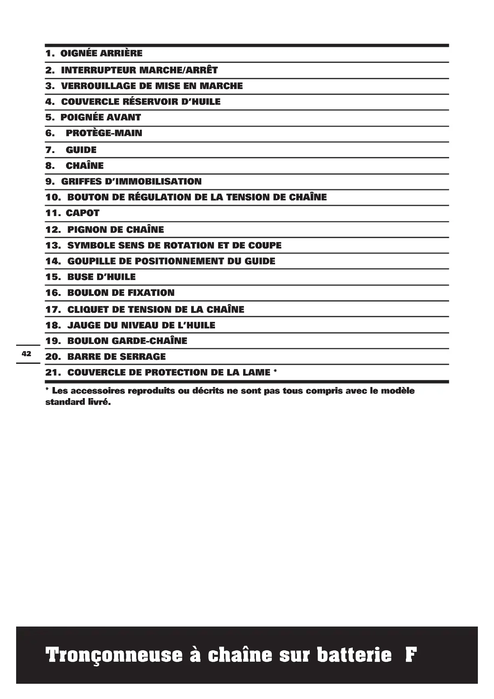 - Les accessoires reproduits ou décrits ne sont pas tous compris avec le modèle standard livré.Tronçonneuse à chaîne sur batterie F