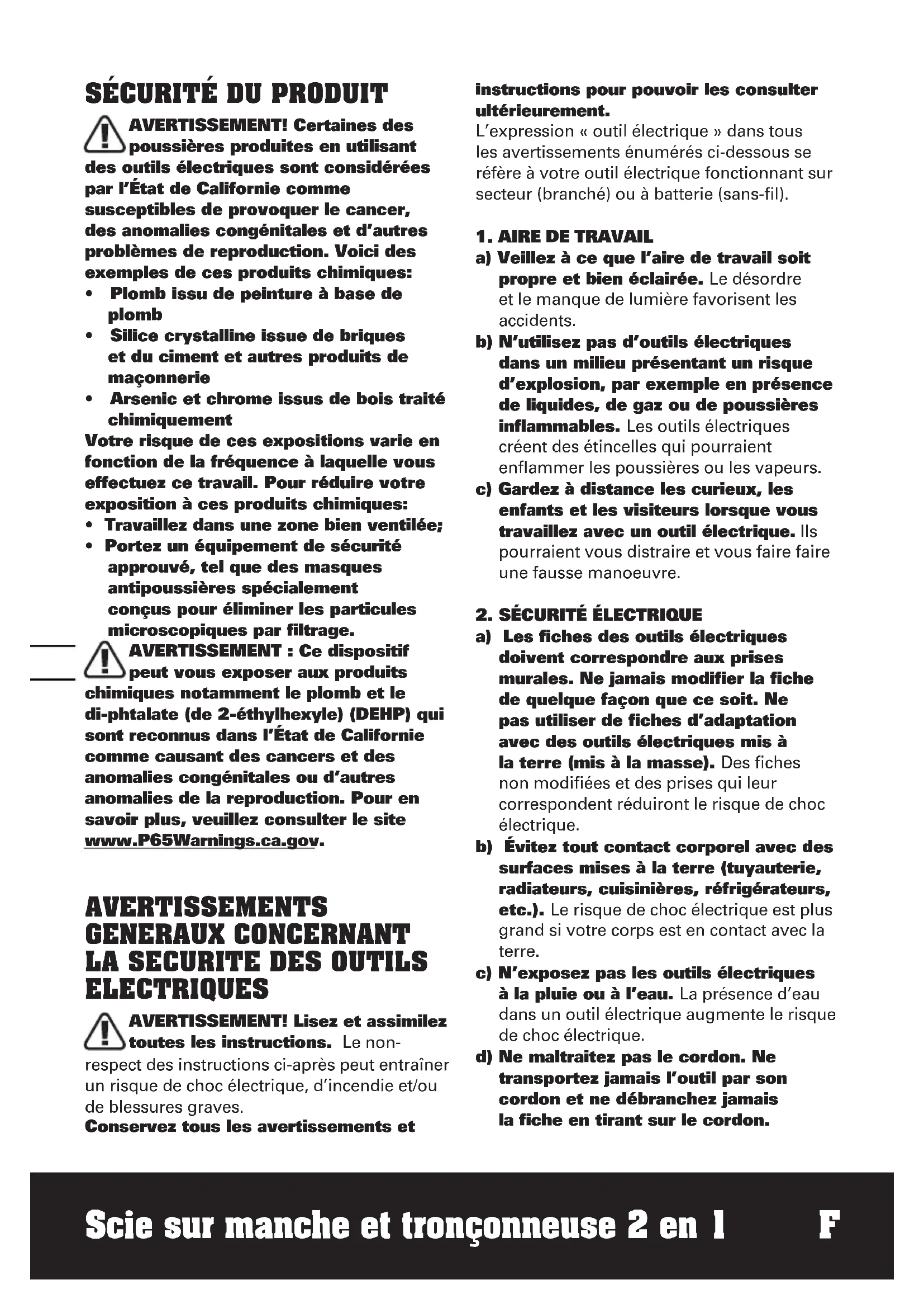 AVERTISSEMENT! Certaines des poussières produites en utilisant des outils électriques sont considérées par l’État de Californie comme susceptibles de provoquer le cancer, des anomalies congénitales et d’autres problèmes de reproduction. Voici des exemples de ces produits chimiques: