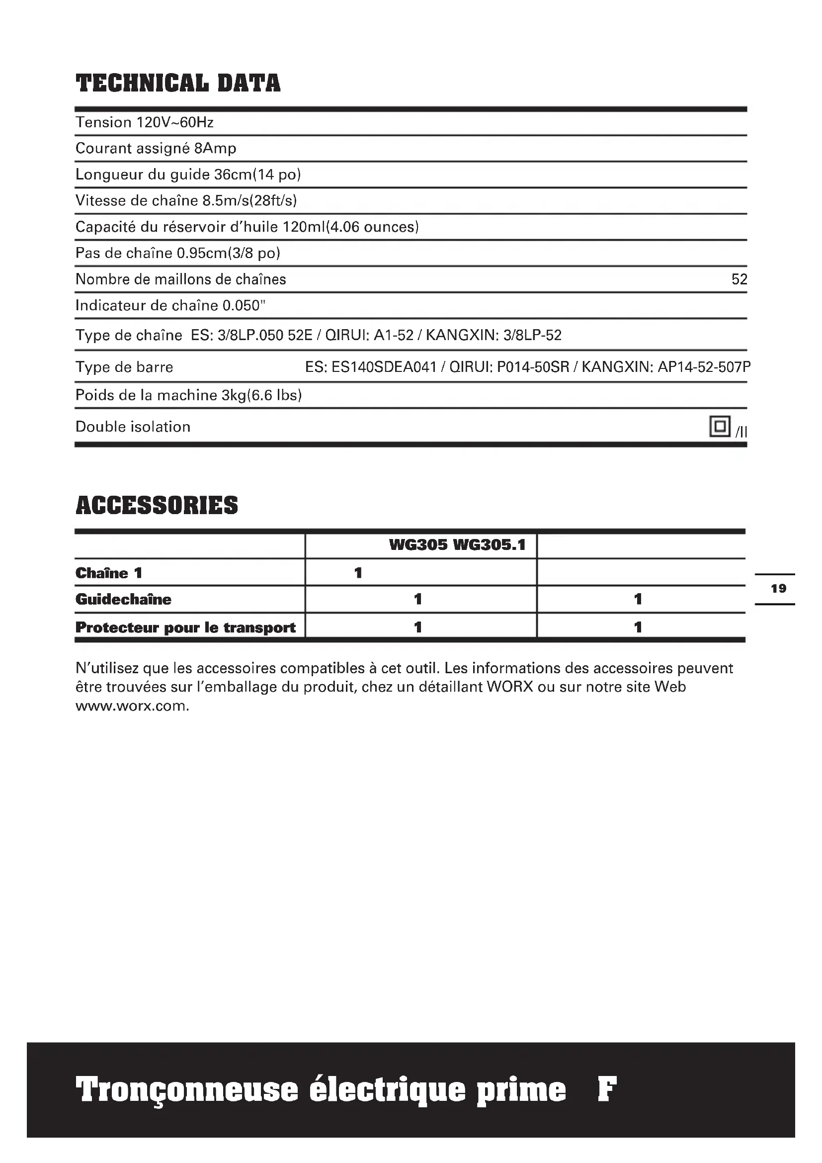 Indicateur de chaîne 0.050" Type de chaîne ES: 3/8LP.050 52E / QIRUI: A1-52 / KANGXIN: 3/8LP-52 Type de barre ES: ES140SDEA041 / QIRUI: P014-50SR / KANGXIN: AP14-52-507P Poids de la machine 3kg(6.6 lbs) Double isolation /II ACCESSORIES WG305 WG305.1 Chaîne 1 1 Guidechaîne 1 1 Protecteur pour le transport 1 1 N’utilisez que les accessoires compatibles à cet outil. Les informations des accessoires peuvent être trouvées sur l’emballage du produit, chez un détaillant WORX ou sur notre site Web www.worx.com.2120 Tronçonneuse électrique prime F AVERTISSEMENT! Certaines des poussières produites en utilisant des outils électriques sont considérées par l’État de Californie comme susceptibles de provoquer le cancer, des anomalies congénitales et d’autres problèmes de reproduction. Voici des exemples de ces produits chimiques: