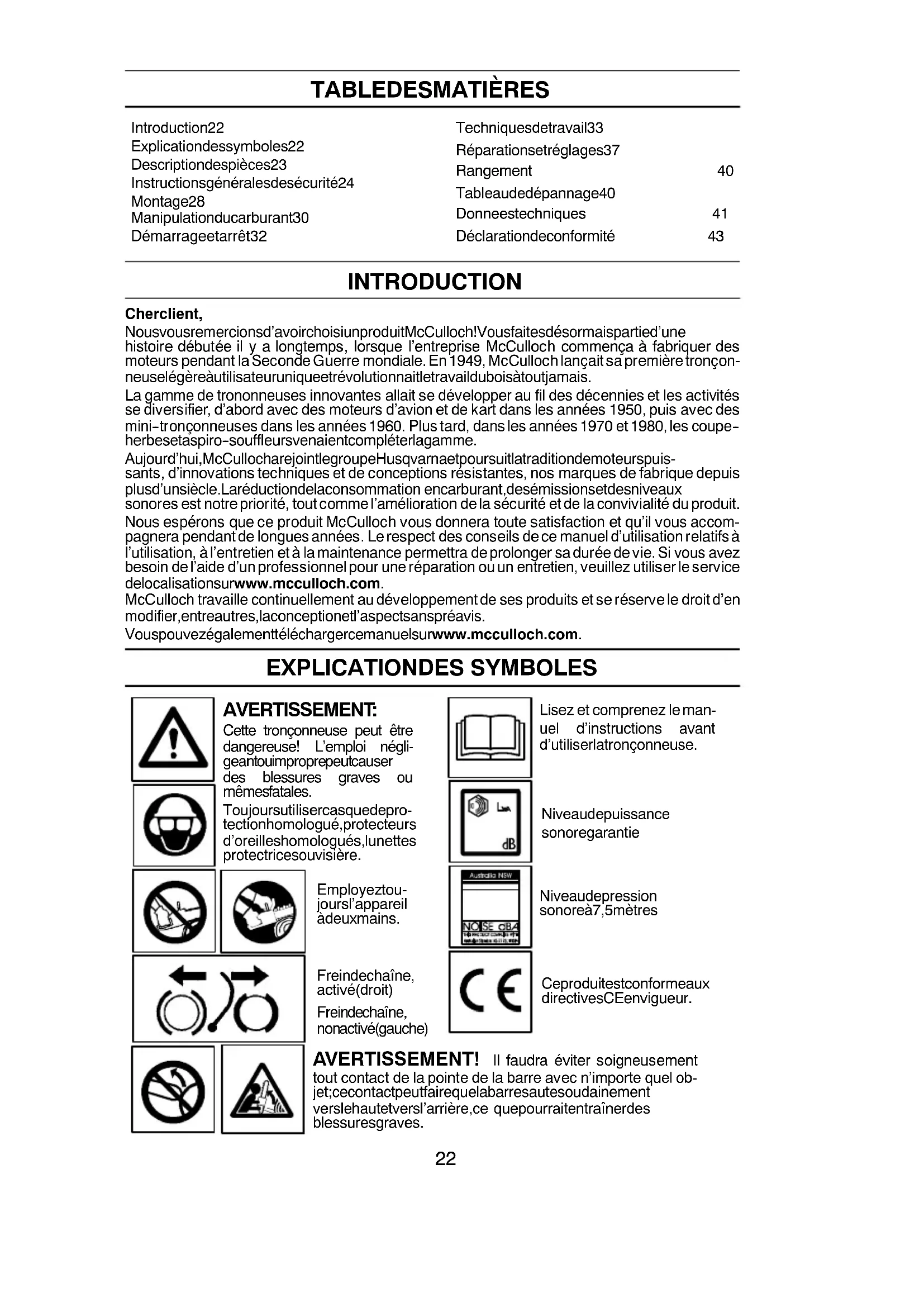 Introduction 22 Explication des symboles 22 Description des pièces 23 Instructions générales de sécurité 24 Montage 28 Manipulation du carburant 30 Démarrage et arrêt 32 Techniques de travail 33 Réparations et réglages 37 Rangement 40 Tableau de dépannage 40 Donnees techniques 41 Déclaration de conformité 43 INTRODUCTION Cher client, Nous vous remercions d’avoir choisi un produit McCulloch! V ous faites désormais partie d’une histoire débutée il y a longtemps, lorsque l’entreprise McCulloch commença à fabriquer des moteurs pendant la Seconde Guerre mondiale.En 1949, McCulloch lançait sa première tronçon- neuse légère à utilisateur unique et révolutionnait le travail du bois à tout jamais. La gamme de trononneuses innovantes allait se développer au fil des décennies et les activités se diversifier, d’abord avec des moteurs d’avion et de kart dans les années 1950, puis avec des mini--tronçonneuses dans les années 1960. Plus tard, dans les années 1970 et1980, les coupe-- herbes et aspiro--souffleurs venaient compléter la gamme. Aujourd’hui, McCulloch a rejoint le groupe Husqvarna et poursuit la tradition de moteurs puis- sants, d’innovations techniques et de conceptions résistantes, nos marques de fabrique depuis plus d’un siècle. La réduction de la consommation en carburant, des émissions et des niveaux sonores est notre priorité, tout comme l’amélioration de la sécurité et de laconvivialité duproduit. Nous espérons que ce produit McCulloch vous donnera toute satisfaction et qu’il vous accom- pagnera pendant de longues années. Le respect des conseils dece manueld’utilisation relatifs à l’utilisation, à l’entretien et à la maintenance permettra de prolonger sa duréede vie. Si vous avez besoin de l’aide d’un professionnel pour une réparation ou un e ntretien, veuillez utiliser le service de localisation sur www.mcculloch.com. McCulloch travaille continuellement au développement de ses produits et se réserve le droitd’en modifier, entre autres, la conception et l’aspect sans préavis. Vous pouvez également télécharger ce manuel sur www.mcculloch.com.
