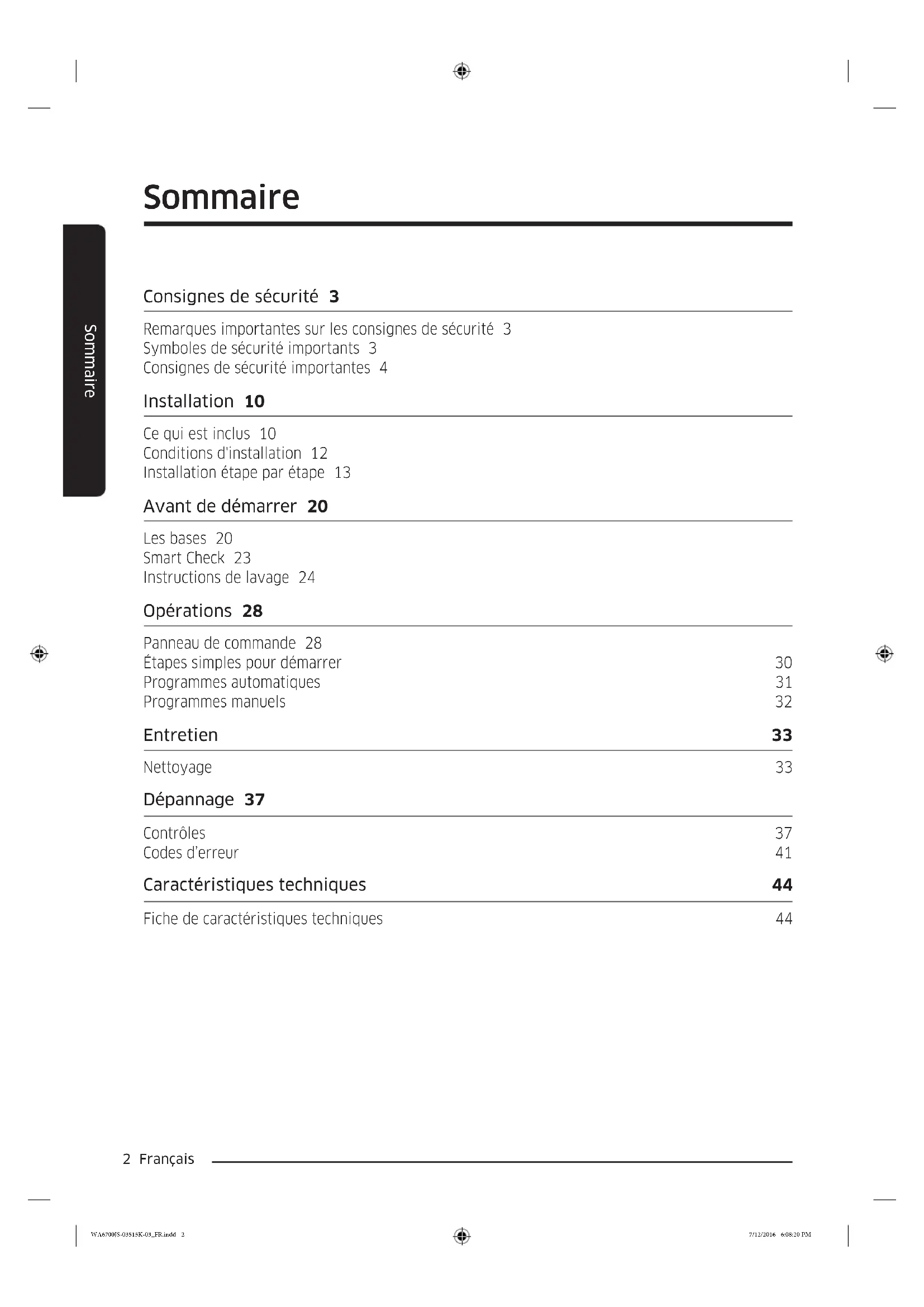 Lave-linge Manuel d'utilisation WA18J675***/WA16J673***/WA16J675*** DC68-03515K-03 WA6700JS-03515K-03_FR.indd 1 7/12/2016 6:08:20 PM2 Français Sommaire Sommaire Consignes de sécurité 3 Remarques importantes sur les consignes de sécurité 3 Symboles de sécurité importants 3 Consignes de sécurité importantes 4 Installation 10 Ce qui est inclus 10 Conditions d'installation 12 Installation étape par étape 13 Avant de démarrer 20 Les bases 20 Smart Check 23 Instructions de lavage 24 Opérations 28 Panneau de commande 28 Étapes simples pour démarrer 30 Programmes automatiques 31 Programmes manuels 32 Entretien 33 Nettoyage 33 Dépannage 37 Contrôles 37 Codes d’erreur 41 Caractéristiques techniques 44 Fiche de caractéristiques techniques 44 WA6700JS-03515K-03_FR.indd 2 7/12/2016 6:08:20 PMFrançais 3 Consignes de sécurité Consignes de sécurité Félicitations pour l'achat de votre nouveau lave-linge Samsung. Ce manuel contient de précieuses informations concernant l'installation, l'utilisation et l'entretien de votre appareil. Prenez le temps de le lire an de tirer pleinement prot de toutes les fonctionnalités qu'offre votre lave-linge. Remarques importantes sur les consignes de sécurité Veuillez lire attentivement ce manuel an d'utiliser cet appareil en toute sécurité et de proter pleinement de toutes ses fonctionnalités. Conservez ce manuel dans un endroit sûr situé à proximité de l'appareil an de pouvoir facilement vous y reporter en cas de besoin. N'utilisez pas cet appareil autrement que pour l'usage auquel il est destiné, conformément aux consignes du manuel. Les consignes de sécurité et les avertissements décrits dans ce manuel ne sont pas exhaustifs. Il est de votre responsabilité de faire preuve de bon sens, de prudence et de discernement lors de l'installation, de l'entretien ou du fonctionnement de votre lave-linge. Les consignes d'utilisation suivantes couvrant plusieurs modèles, il se peut que les caractéristiques de votre lave-linge diffèrent légèrement de celles décrites dans ce manuel ; ainsi, certaines icônes d'avertissement peuvent ne pas s'appliquer à votre machine. Pour toute question, contactez votre centre de réparation le plus proche ou connectez-vous sur www.samsung.com. Symboles de sécurité importants Signication des icônes et signes repris dans ce manuel d'utilisation : AVERTISSEMENT Risques ou pratiques inadaptées susceptibles de causer des blessures graves, la mort et/ou des dommages matériels. ATTENTION Risques ou pratiques inadaptées susceptibles de causer des blessures et/ou des dommages matériels. REMARQUE Indique la présence d'un risque de blessures ou de dommages matériels WA6700JS-03515K-03_FR.indd 3 7/12/2016 6:08:20 PM4 Français Consignes de sécurité Consignes de sécurité Ces symboles d'avertissement ont pour but d'éviter tout risque de blessure corporelle. Respectez-les en toutes circonstances. Lisez attentivement ce manuel et conservez-le en lieu sûr an de pouvoir le consulter ultérieurement. Lisez attentivement toutes les consignes avant d'utiliser l'appareil. Comme avec tout équipement électrique ou comportant des parties mobiles, il existe un certain nombre de dangers potentiels. Pour utiliser cet appareil en toute sécurité, familiarisez-vous avec son fonctionnement et restez prudent lorsque vous l'employez. Consignes de sécurité importantes AVERTISSEMENT An de réduire les risques d'incendie, d'électrocution ou de blessures physiques lors de l'utilisation de l'appareil, des précautions de base doivent être prises :