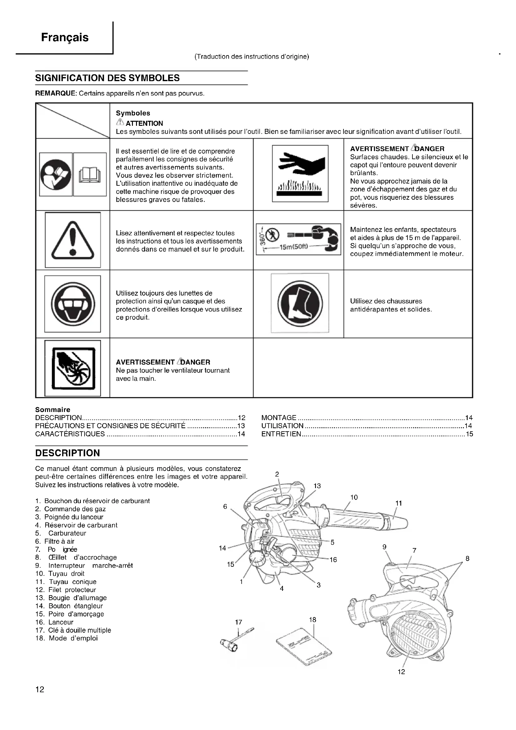 - REMARQUE: Certains appareils n’en sont pas pourvus. Symboles ATTENTION Les symboles suivants sont utilisés pour l’outil. Bien se familiariser avec leur signifi cation avant d’utiliser l’outil. Il est essentiel de lire et de comprendre parfaitement les consignes de sécurité et autres avertissements suivants. Vous devez les observer strictement. L’utilisation inattentive ou inadéquate de cette machine risque de provoquer des blessures graves ou fatales. AVERTISSEMENT DANGER Surfaces chaudes. Le silencieux et le capot qui l’entoure peuvent devenir brûlants. Ne vous approchez jamais de la zone d’échappement des gaz et du pot, vous risqueriez des blessures sévères. Lisez attentivement et respectez toutes les instructions et tous les avertissements donnés dans ce manuel et sur le produit. Maintenez les enfants, spectateurs et aides à plus de 15 m de l’appareil. Si quelqu’un s’approche de vous, coupez immédiatemment le moteur. Utilisez toujours des lunettes de protection ainsi qu’un casque et des protections d’oreilles lorsque vous utilisez ce produit. Utilisez des chaussures antidérapantes et solides. AVERTISSEMENT DANGER Ne pas toucher le ventilateur tournant avec la main. Sommaire DESCRIPTION p. 12