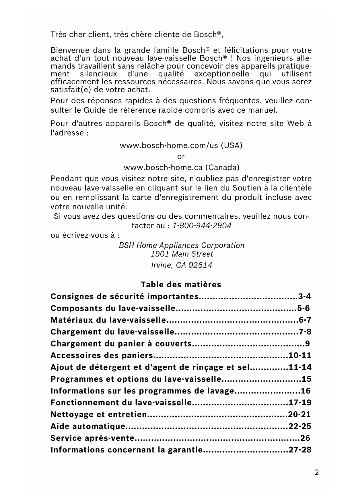 - www.bosch-home.ca (Canada) Pendant que vous visitez notre site, n'oubliez pas d'enregistrer votre nouveau lave-vaisselle en cliquant sur le lien du Soutien à la clientèle ou en remplissant la carte d'enregistrement du produit incluse avec votre nouvelle unité. Si vous avez des questions ou des commentaires, veuillez nous con- tacter au : 1-800-944-2904 ou écrivez-vous à : BSH Home Appliances Corporation 1901 Main Street Irvine, CA 92614 Table des matières Consignes de sécurité importantes p. 3