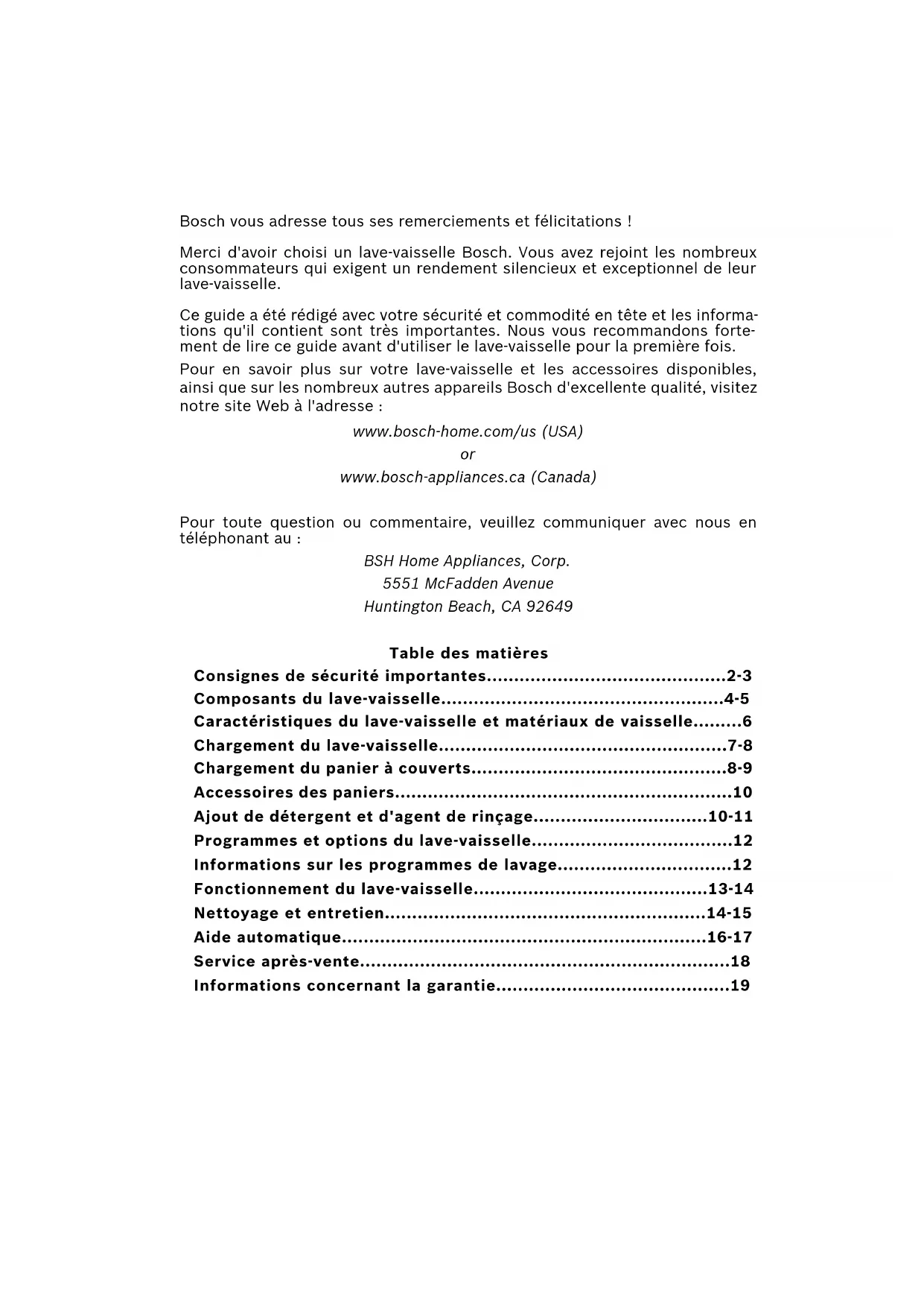 - www.bosch-appliances.ca (Canada) Pour toute question ou commentaire, veuillez communiquer avec nous en téléphonant au : BSH Home Appliances, Corp. 5551 McFadden Avenue Huntington Beach, CA 92649 Table des matières Consignes de sécurité importantes p. 2