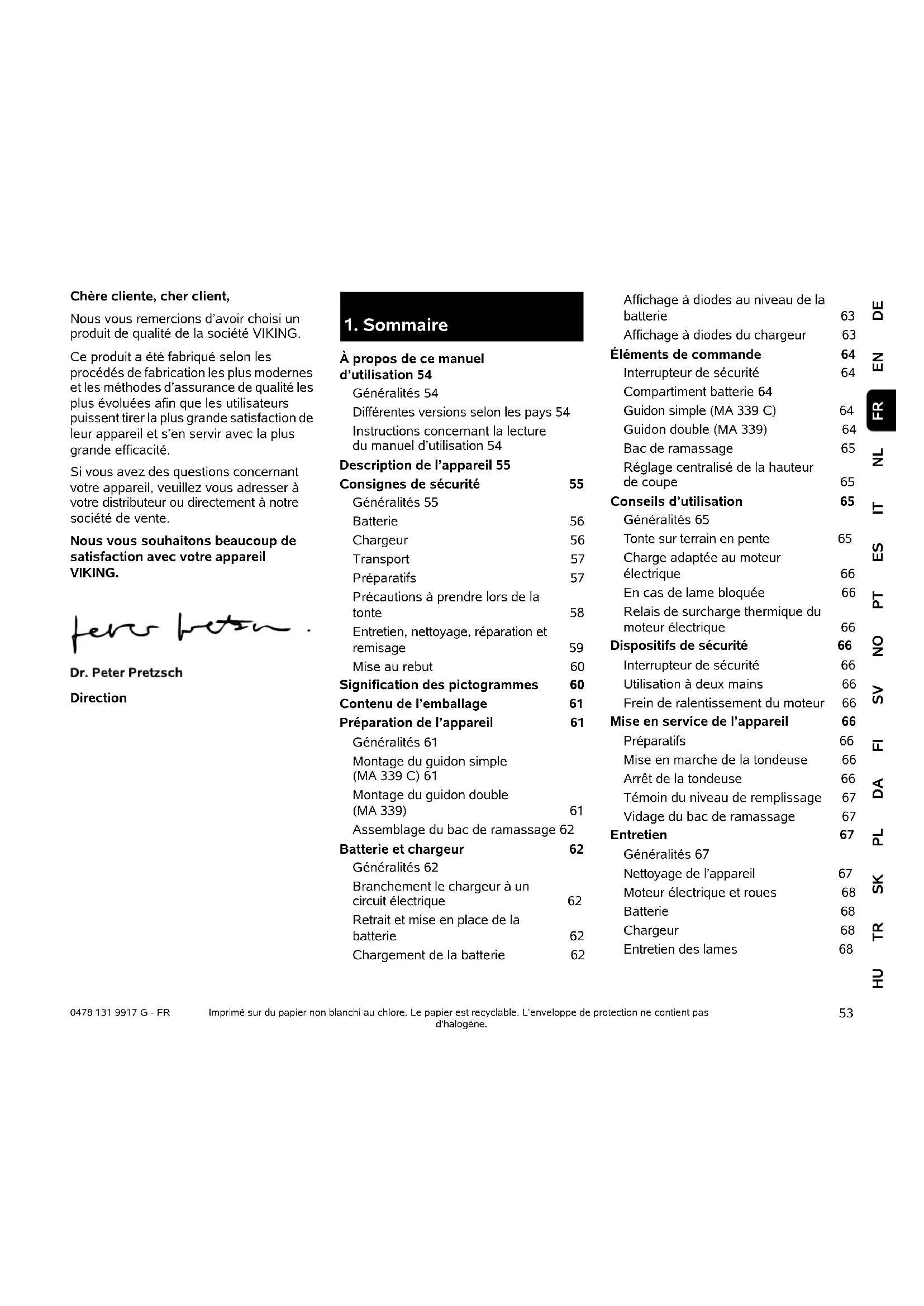 DEENNLITESPTNOSVFIDAPLSKTRHU FR 0478 131 9917 G - FR Chère cliente, cher client, Nous vous remercions d’avoir choisi un produit de qualité de la société VIKING. Ce produit a été fabriqué selon les procédés de fabrication les plus modernes et les méthodes d’assurance de qualité les plus évoluées afin que les utilisateurs puissent tirer la plus grande satisfaction de leur appareil et s’en servir avec la plus grande efficacité. Si vous avez des questions concernant votre appareil, veuillez vous adresser à votre distributeur ou directement à notre société de vente. Nous vous souhaitons beaucoup de satisfaction avec votre appareil VIKING. Direction Imprimé sur du papier non blanchi au chlore. Le papier est recyclable. L’enveloppe de protection ne contient pas d’halogène.