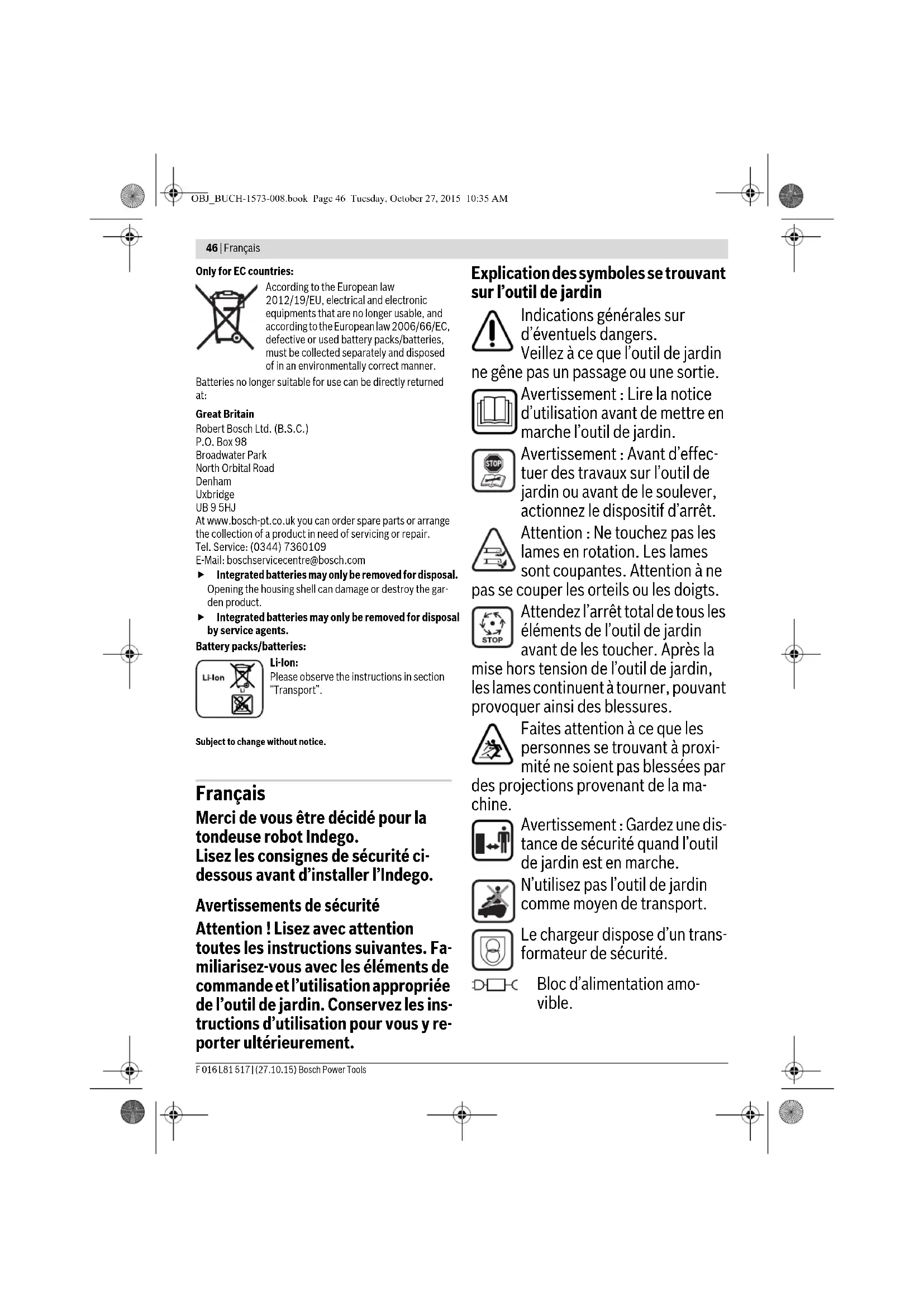 tance de sécurité quand l’outil de jardin est en marche. N’utilisez pas l’outil de jardin comme moyen de transport. Le chargeur dispose d’un trans- formateur de sécurité. Bloc d’alimentation amo- vible. OBJ_BUCH-1573-008.book Page 46 Tuesday, October 27, 2015 10:35 AMFrançais | 47 Bosch Power Tools F 016 L81 517 | (27.10.15) Ne pas utiliser de nettoyeur haute pression ou tuyau d’ar- rosage pour nettoyer la ton- deuse robot. Mode d’emploi Retirer le sectionneur avant d’ef- fectuer des travaux sur l’outil de jardin (par ex. travaux d’entretien, changement d’outils, etc.), ainsi qu’avant de le transporter ou de le ranger. Ne permettez jamais à des enfants ou à des personnes qui n’ont pas pris connaissance de ces instructions d’utiliser cet outil de jardin. Il se peut que des dispositions locales fixent l’âge minimum de l’utilisateur. Cet outil de jardin doit être utilisé par des personnes disposant des capaci- tés physiques adaptées et de l’expé- rience et/ou des connaissances né- cessaires. Si tel n’était pas le cas ou en cas d’utilisation de cet outil par des enfants, cette utilisation ne sera possible que sous la surveillance d’une personne responsable de la sé- curité des utilisateurs ou que ces der- niers aient été instruits quant au ma- niement de l’outil. Dans le cas contraire, un risque de mauvaise utili- sation et de blessures existe. Les enfants doivent etre surveilles pour assurer qu’ils ne jouent pas avec l’outil de jardin. L’opérateur ou l’utilisateur de la ton- deuse est responsable des accidents et des dommages causés à autrui ou à ses biens. Actionnez immédiatement la touche d’arrêt rouge, si des dangers se pré- sentaient lors de l’utilisation de l’outil de jardin. Veillez à assurer l’installation cor- recte du câble périphérique confor- mément aux instructions d’utilisa- tion. Contrôlez le câble périphérique. Il doit être tendu sur la longueur entière et être attaché au sol à l’aide de pi- quets sans faire des boucles. Contrôlez régulièrement la zone d’uti- lisation de l’outil de jardin et retirez pierres, bâtons, fils et tout autre objet étranger. Ne pas passer par dessus les câbles d’alimentation sous tension. Contrôlez régulièrement l’outil de jar- din pour vous assurer que les lames, les vis de lames et le dispositif de coupe ne sont pas usés ou endomma- gés. Remplacez toujours le set entier de lames et de vis usées ou endom- magées pour éviter des vibrations. N’utilisez jamais l’outil de jardin si les capots de protection sont endomma- gés ou sans dispositifs de sécurité. Tenez les pieds et les mains éloignés des parties rotatives de l’outil de jar- din. Ne soulevez ni transportez jamais l’outil de jardin pendant que le mo- teur est en marche. Ne laissez jamais l’outil de jardin en marche sans surveillance, si des ani- maux domestiques, des enfants ou d’autres personnes se trouvent à proximité. OBJ_BUCH-1573-008.book Page 47 Tuesday, October 27, 2015 10:35 AM48 | Français F 016 L81 517 | (27.10.15) Bosch Power Tools Mettez l’outil de jardin en marche conformément aux instructions d’uti- lisation et veillez à garder une dis- tance de sécurité entre vous et les parties en rotation. Ne faites pas fonctionner l’outil de jardin en même temps qu’un arro- seur. Réglez les horaires pour assurer que les deux systèmes ne travaillent pas simultanément. N’effectuez aucune modification sur l’outil de jardin. Des modifica- tions non autorisées peuvent s’avérer préjudiciables à la sécurité de votre outil de jardin et conduiront à une augmentation des émissions de bruit et des vibrations. Retirer le sectionneur : – avant d’éliminer un engorgement, – pour contrôler, nettoyer ou effectuer des travaux sur l’outil de jardin, – si l’outil de jardin vibrait de manière inhabituelle (arrêter l’outil de jardin et le contrôler immédiatement), – si l’outil heurte un objet étranger. Contrôlez si l’outil de jardin présente des dommages et contactez le Ser- vice Après-Vente Bosch pour faire ef- fectuer les réparations nécessaires. Entretien Portez toujours des gants de jar- din, si vous manipulez l’appareil ou travaillez à proximité des lames ai- guës. Avant d’effectuer des travaux sur l’outil de jardin, retirez le section- neur. Avant d’effectuer des travaux sur la station de charge ou sur l’appa- reil d’alimentation, retirez la fiche de la prise de courant. Nettoyez soigneusement les parties ex- térieures de l’outil de jardin à l’aide d’une brosse douce ou d’un chiffon. N’utilisez pas d’eau, de solvants ou de détergents abrasifs. Enlevez toutes les herbes et particules pouvant adhérer à l’outil et notamment aux ouïes de ventilation. Retournez l’outil de jardin de sorte à ce que la face inférieure soit dirigée vers le haut et nettoyez régulièrement la zone des lames. Utilisez une brosse dure ou un grattoir pour enlever les encrasse- ments particulièrement résistants. (voir figure A) Les lames sont réversibles. (voir figure B) Vérifiez que tous les écrous, boulons et vis sont bien serrés afin d’assurer que l’outil de jardin se trouve dans un état de fonctionnement ne présen- tant aucun danger. Contrôlez régulièrement l’outil de jar- din et, pour votre sécurité, remplacez les pièces usées et endommagées. Veillez à n’utiliser que des pièces de rechange Bosch d’origine. Le cas échéant, remplacez le set en- tier des lames et vis. Transport et stockage en hiver Avant de ranger l’outil de jardin, re- tirez le sectionneur. L’Indego est prêt à être utilisé par des températures entre 5 °C et 45 °C. OBJ_BUCH-1573-008.book Page 48 Tuesday, October 27, 2015 10:35 AMFrançais | 49 Bosch Power Tools F 016 L81 517 | (27.10.15) Rangez l’Indego et la station de charge pendant l’hiver si les tempéra- tures sont en permanence en