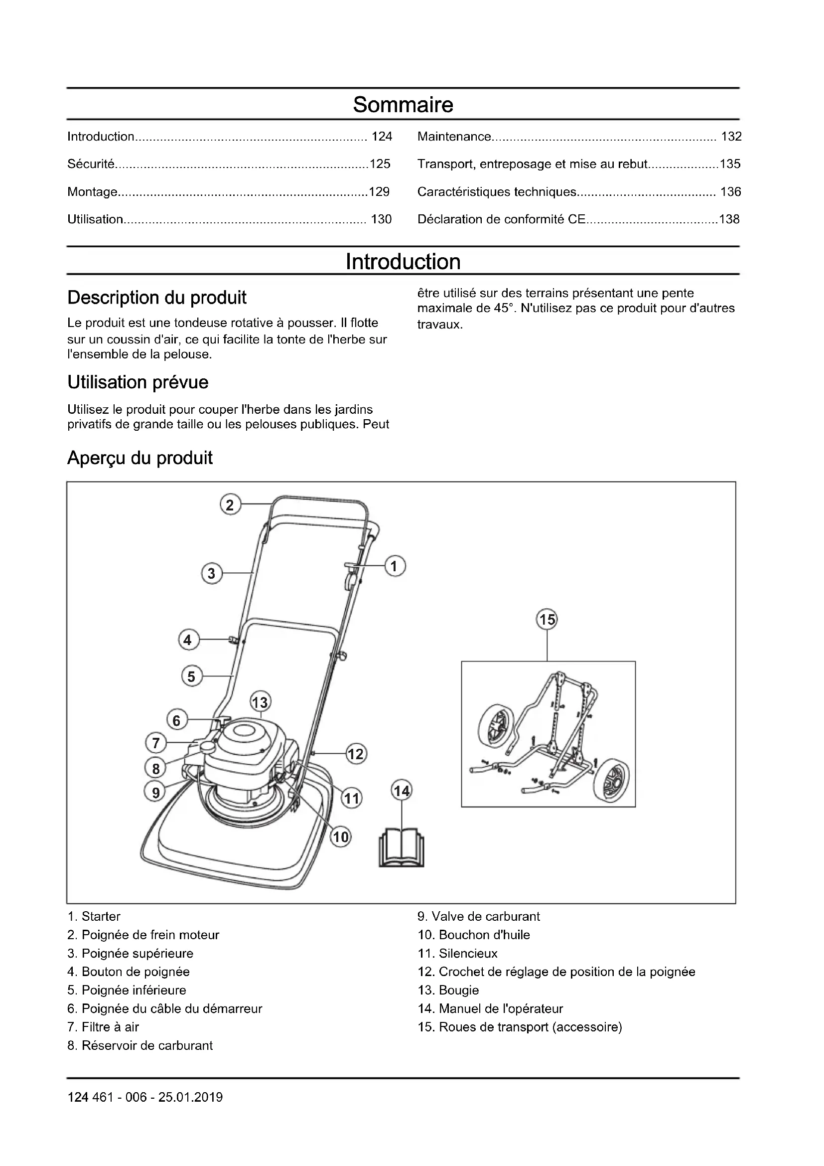 - Déclaration de conformité CE Introduction Description du produit Le produit est une tondeuse rotative à pousser. Il flotte sur un coussin d'air, ce qui facilite la tonte de l'herbe sur l'ensemble de la pelouse. Utilisation prévue Utilisez le produit pour couper l'herbe dans les jardins privatifs de grande taille ou les pelouses publiques. Peut être utilisé sur des terrains présentant une pente maximale de 45°. N'utilisez pas ce produit pour d'autres travaux. Aperçu du produit p. 138