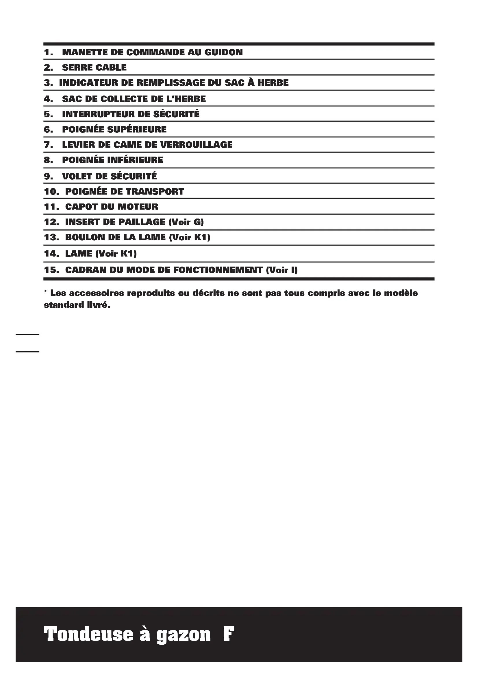 ACCESSOIRES Clé 1 Sac de collecte de l’herbe 1 Insert de paillage 1 Levier de came de verrouillage 2 Serre cable 2 Nous recommandons d’acheter tous les accessoires dans le magasin d’acquisition de la machine. Il est impératif d’utiliser des accessoires de bonne qualité et de marque connue et de choisir l’accessoire correct recommandé dans ce manuel. Pour plus d’informations, se référer à l’emballage des accessoires. Le personnel du magasin est également là pour vous conseiller.2928 Tondeuse à gazon f