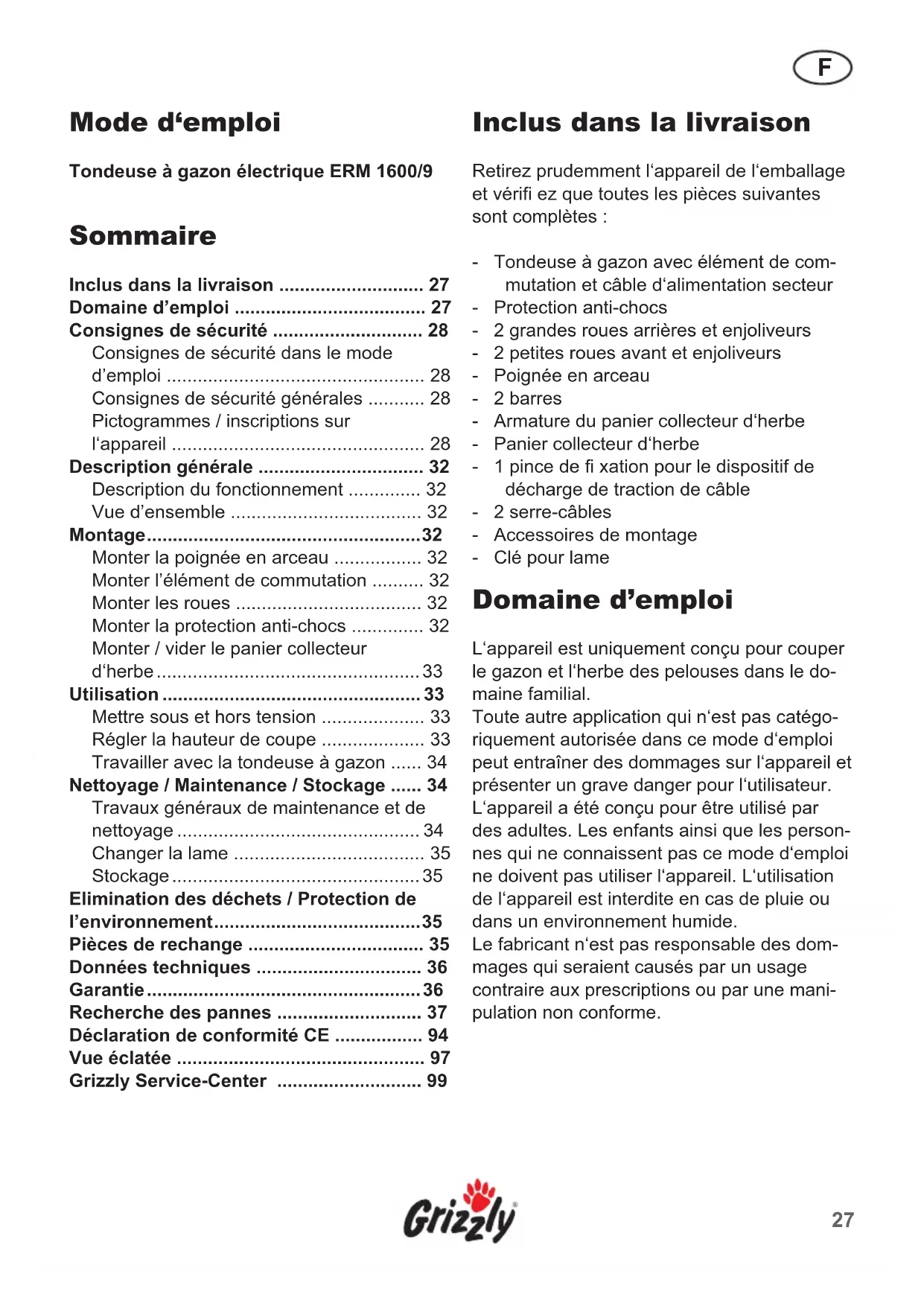 - Grizzly Service-Center Mode d‘emploi Tondeuse à gazon électrique ERM 1600/9 Inclus dans la livraison Retirez prudemment l‘appareil de l‘emballage et vérifi ez que toutes les pièces suivantes sont complètes : - Tondeuse à gazon avec élément de com- mutation et câble d‘alimentation secteur - Protection anti-chocs - 2 grandes roues arrières et enjoliveurs - 2 petites roues avant et enjoliveurs - Poignée en arceau - 2 barres - Armature du panier collecteur d‘herbe - Panier collecteur d‘herbe - 1 pince de fi xation pour le dispositif de décharge de traction de câble - 2 serre-câbles - Accessoires de montage - Clé pour lame Domaine d’emploi L‘appareil est uniquement conçu pour couper le gazon et l‘herbe des pelouses dans le do- maine familial. Toute autre application qui n‘est pas catégo- riquement autorisée dans ce mode d‘emploi peut entraîner des dommages sur l‘appareil et présenter un grave danger pour l‘utilisateur. L‘appareil a été conçu pour être utilisé par des adultes. Les enfants ainsi que les person- nes qui ne connaissent pas ce mode d‘emploi ne doivent pas utiliser l‘appareil. L‘utilisation de l‘appareil est interdite en cas de pluie ou dans un environnement humide. Le fabricant n‘est pas responsable des dom- mages qui seraient causés par un usage contraire aux prescriptions ou par une mani- pulation non conforme.28 p. 99