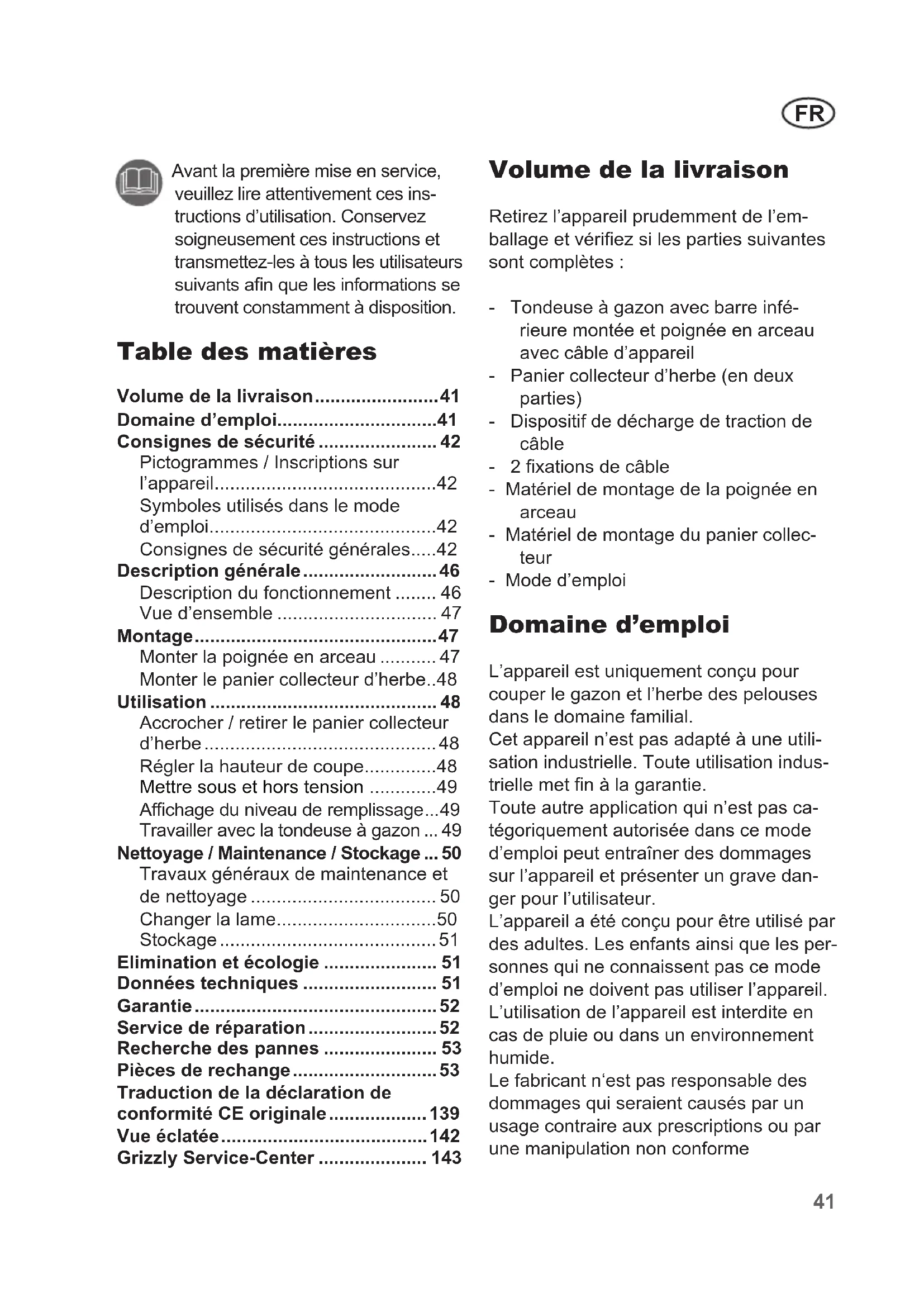 - Grizzly Service-Center Volume de la livraison Retirez l’appareil prudemment de l’em- ballage et vériez si les parties suivantes sont complètes : - Tondeuse à gazon avec barre infé- rieure montée et poignée en arceau avec câble d’appareil - Panier collecteur d’herbe (en deux parties) - Dispositif de décharge de traction de câble - 2 xations de câble - Matériel de montage de la poignée en arceau - Matériel de montage du panier collec- teur - Mode d’emploi Domaine d’emploi L’appareil est uniquement conçu pour couper le gazon et l’herbe des pelouses dans le domaine familial. Cet appareil n’est pas adapté à une utili- sation industrielle. Toute utilisation indus- trielle met n à la garantie. Toute autre application qui n’est pas ca- tégoriquement autorisée dans ce mode d’emploi peut entraîner des dommages sur l’appareil et présenter un grave dan- ger pour l’utilisateur. L’appareil a été conçu pour être utilisé par des adultes. Les enfants ainsi que les per- sonnes qui ne connaissent pas ce mode d’emploi ne doivent pas utiliser l’appareil. L’utilisation de l’appareil est interdite en cas de pluie ou dans un environnement humide. Le fabricant n‘est pas responsable des dommages qui seraient causés par un usage contraire aux prescriptions ou par une manipulation non conforme Avant la première mise en service, veuillez lire attentivement ces ins- tructions d’utilisation. Conservez soigneusement ces instructions et transmettez-les à tous les utilisateurs suivants an que les informations se trouvent constamment à disposition.FR p. 143
