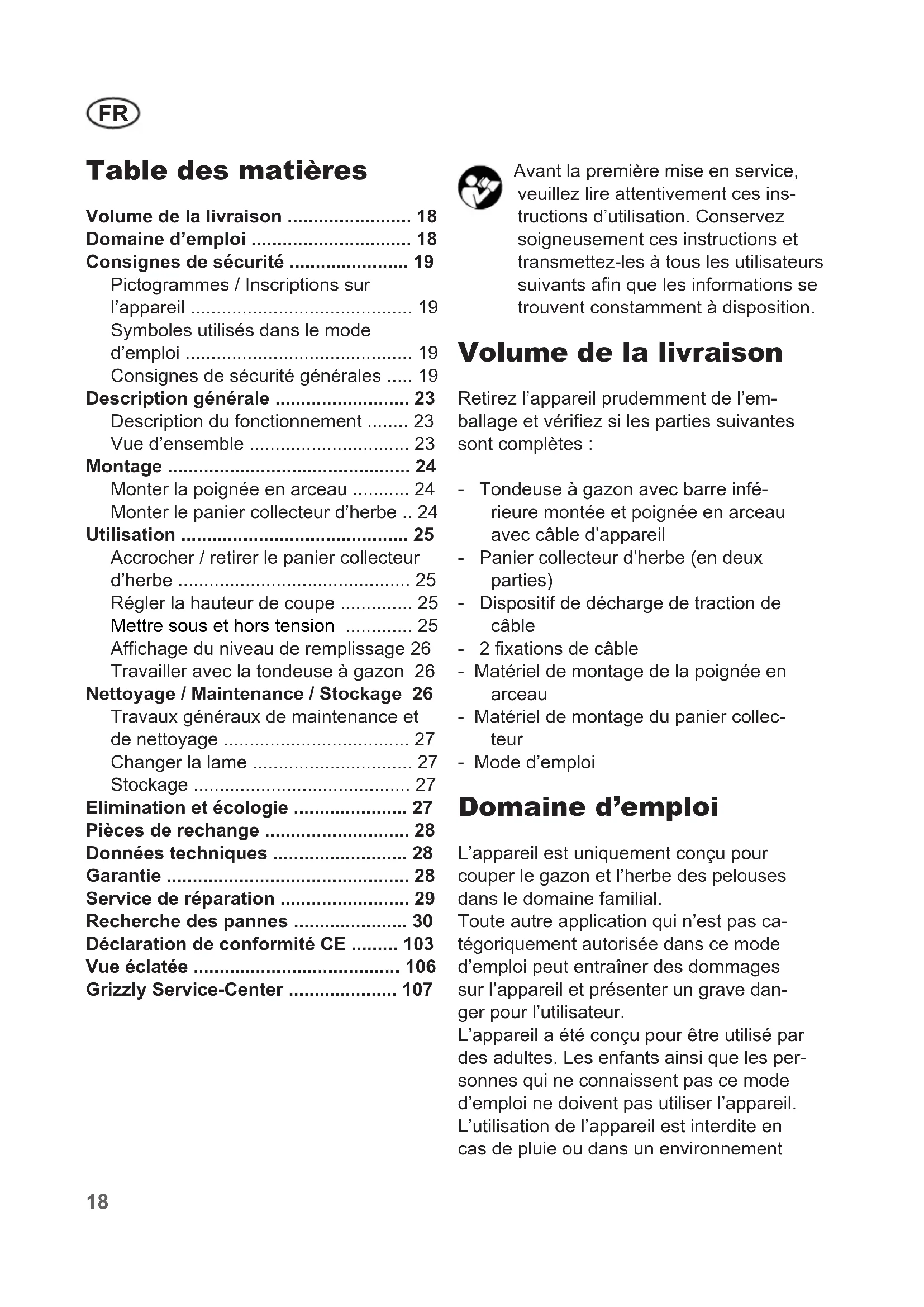 - Grizzly Service-Center Avant la première mise en service, veuillez lire attentivement ces ins- tructions d’utilisation. Conservez soigneusement ces instructions et transmettez-les à tous les utilisateurs suivants an que les informations se trouvent constamment à disposition. Volume de la livraison Retirez l’appareil prudemment de l’em- ballage et vériez si les parties suivantes sont complètes : - Tondeuse à gazon avec barre infé- rieure montée et poignée en arceau avec câble d’appareil - Panier collecteur d’herbe (en deux parties) - Dispositif de décharge de traction de câble - 2 xations de câble - Matériel de montage de la poignée en arceau - Matériel de montage du panier collec- teur - Mode d’emploi Domaine d’emploi L’appareil est uniquement conçu pour couper le gazon et l’herbe des pelouses dans le domaine familial. Toute autre application qui n’est pas ca- tégoriquement autorisée dans ce mode d’emploi peut entraîner des dommages sur l’appareil et présenter un grave dan- ger pour l’utilisateur. L’appareil a été conçu pour être utilisé par des adultes. Les enfants ainsi que les per- sonnes qui ne connaissent pas ce mode d’emploi ne doivent pas utiliser l’appareil. L’utilisation de l’appareil est interdite en cas de pluie ou dans un environnementFR p. 107