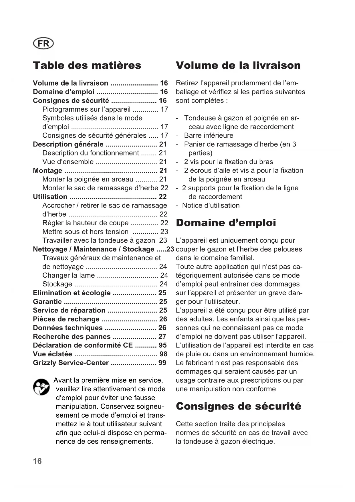- Grizzly Service-Center Avant la première mise en service, veuillez lire attentivement ce mode d’emploi pour éviter une fausse manipulation. Conservez soigneu- sement ce mode d’emploi et trans- mettez le à tout utilisateur suivant an que celui-ci dispose en perma- nence de ces renseignements. Volume de la livraison Retirez l’appareil prudemment de l’em- ballage et vériez si les parties suivantes sont complètes : - Tondeuse à gazon et poignée en ar- ceau avec ligne de raccordement - Barre inférieure - Panier de ramassage d’herbe (en 3 parties) - 2 vis pour la xation du bras - 2 écrous d’aile et vis à pour la xation de la poignée en arceau - 2 supports pour la xation de la ligne de raccordement - Notice d’utilisation Domaine d’emploi L’appareil est uniquement conçu pour couper le gazon et l’herbe des pelouses dans le domaine familial. Toute autre application qui n’est pas ca- tégoriquement autorisée dans ce mode d’emploi peut entraîner des dommages sur l’appareil et présenter un grave dan- ger pour l’utilisateur. L’appareil a été conçu pour être utilisé par des adultes. Les enfants ainsi que les per- sonnes qui ne connaissent pas ce mode d’emploi ne doivent pas utiliser l’appareil. L’utilisation de l’appareil est interdite en cas de pluie ou dans un environnement humide. Le fabricant n‘est pas responsable des dommages qui seraient causés par un usage contraire aux prescriptions ou par une manipulation non conforme Consignes de sécurité Cette section traite des principales normes de sécurité en cas de travail avec la tondeuse à gazon électrique.FR p. 99