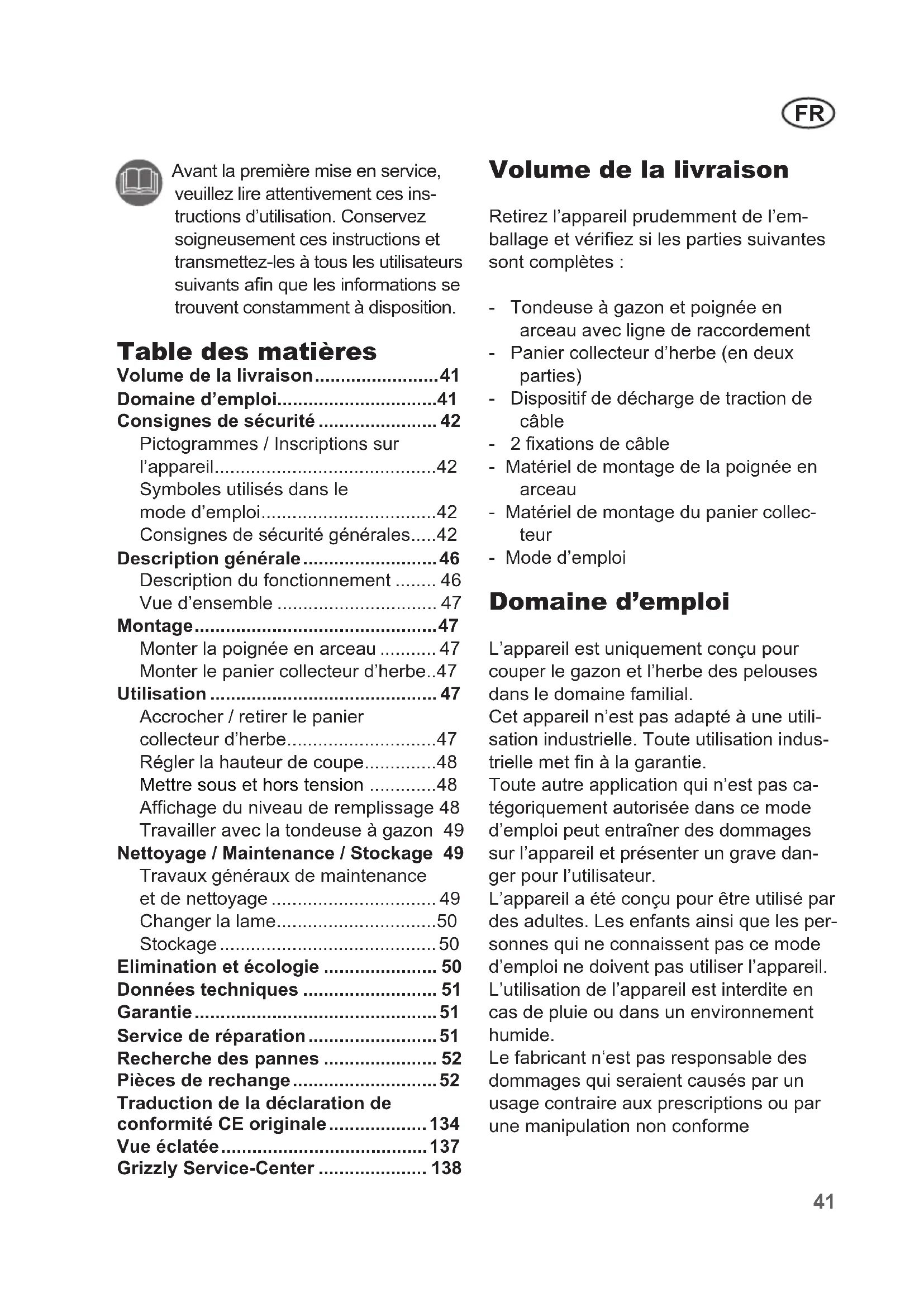 L'appareil est uniquement concu pour couper le gazon et l'herbe des pelouses dans le domaine familial.