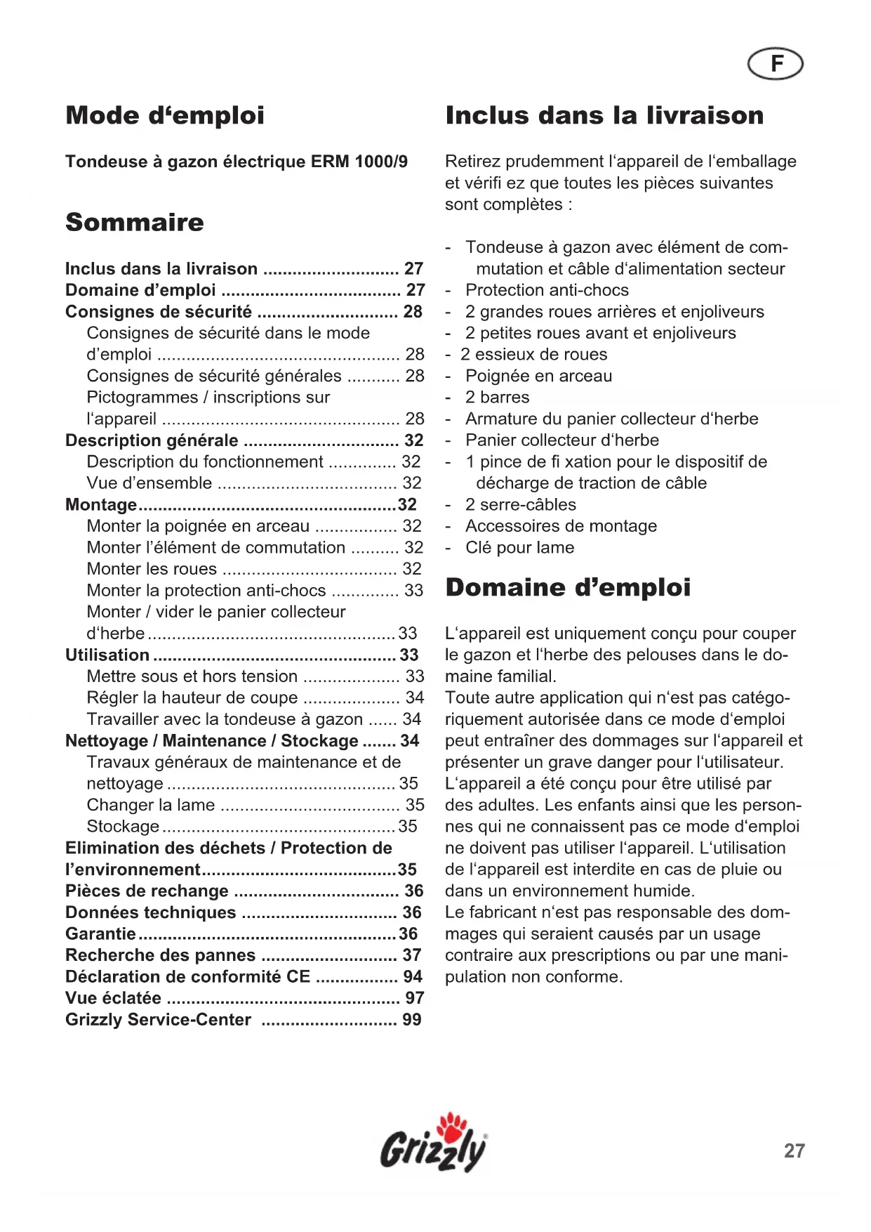 - Grizzly Service-Center Mode d‘emploi Tondeuse à gazon électrique ERM 1000/9 Inclus dans la livraison Retirez prudemment l‘appareil de l‘emballage et vérifi ez que toutes les pièces suivantes sont complètes : - Tondeuse à gazon avec élément de com- mutation et câble d‘alimentation secteur - Protection anti-chocs - 2 grandes roues arrières et enjoliveurs - 2 petites roues avant et enjoliveurs - 2 essieux de roues - Poignée en arceau - 2 barres - Armature du panier collecteur d‘herbe - Panier collecteur d‘herbe - 1 pince de fi xation pour le dispositif de décharge de traction de câble - 2 serre-câbles - Accessoires de montage - Clé pour lame Domaine d’emploi L‘appareil est uniquement conçu pour couper le gazon et l‘herbe des pelouses dans le do- maine familial. Toute autre application qui n‘est pas catégo- riquement autorisée dans ce mode d‘emploi peut entraîner des dommages sur l‘appareil et présenter un grave danger pour l‘utilisateur. L‘appareil a été conçu pour être utilisé par des adultes. Les enfants ainsi que les person- nes qui ne connaissent pas ce mode d‘emploi ne doivent pas utiliser l‘appareil. L‘utilisation de l‘appareil est interdite en cas de pluie ou dans un environnement humide. Le fabricant n‘est pas responsable des dom- mages qui seraient causés par un usage contraire aux prescriptions ou par une mani- pulation non conforme.28 p. 99