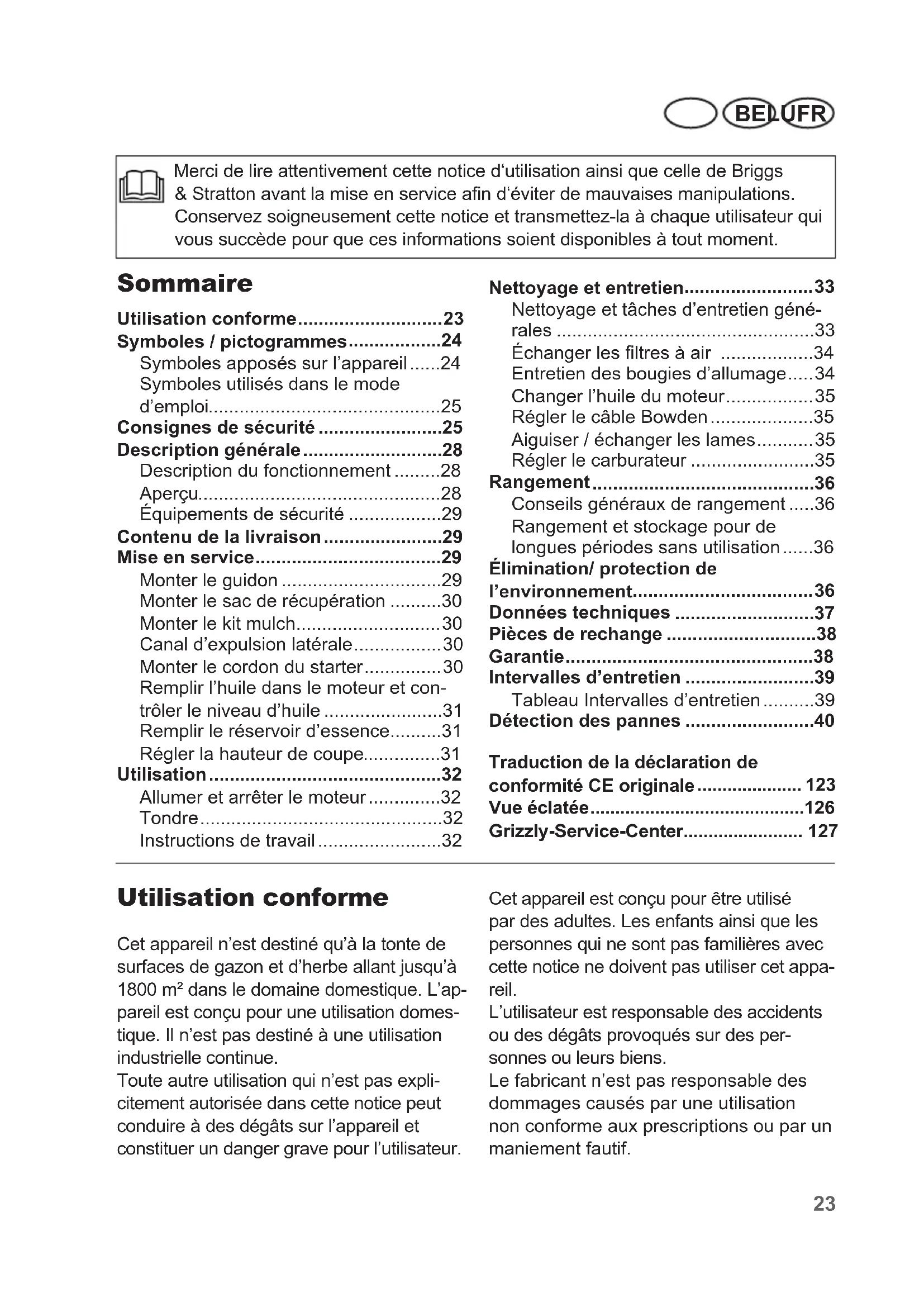 Grizzly-Service-Center........................ 127 Merci de lire attentivement cette notice d‘utilisation ainsi que celle de Briggs & Stratton avant la mise en service an d‘éviter de mauvaises manipulations. Conservez soigneusement cette notice et transmettez-la à chaque utilisateur qui vous succède pour que ces informations soient disponibles à tout moment.24 FR BE LU