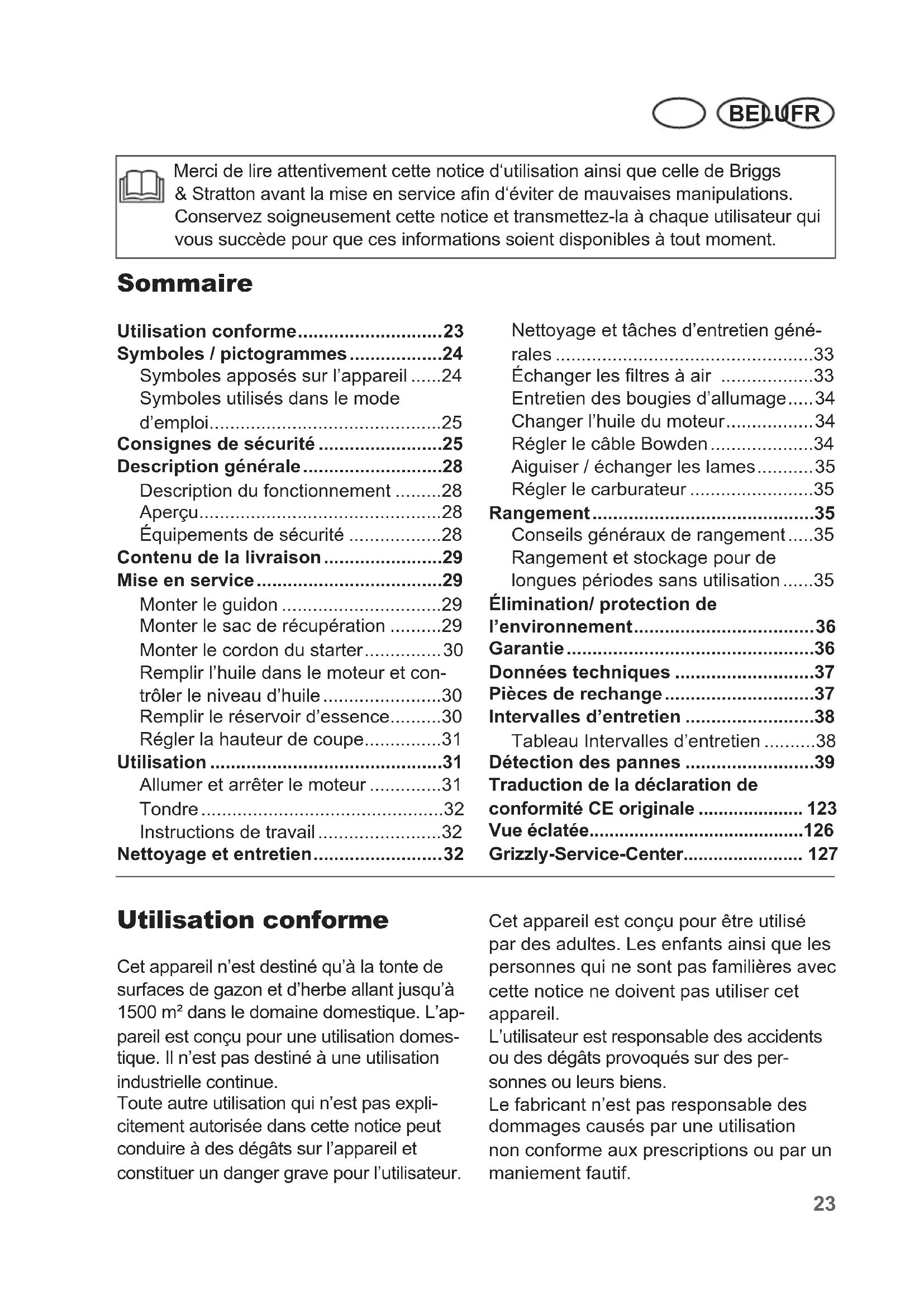 Merci de dire attentivement cette notice d'utilisation ainsi que celle de Briggs & Stratton avant la mise en service afin d'eviter de mauvaises manipulations.