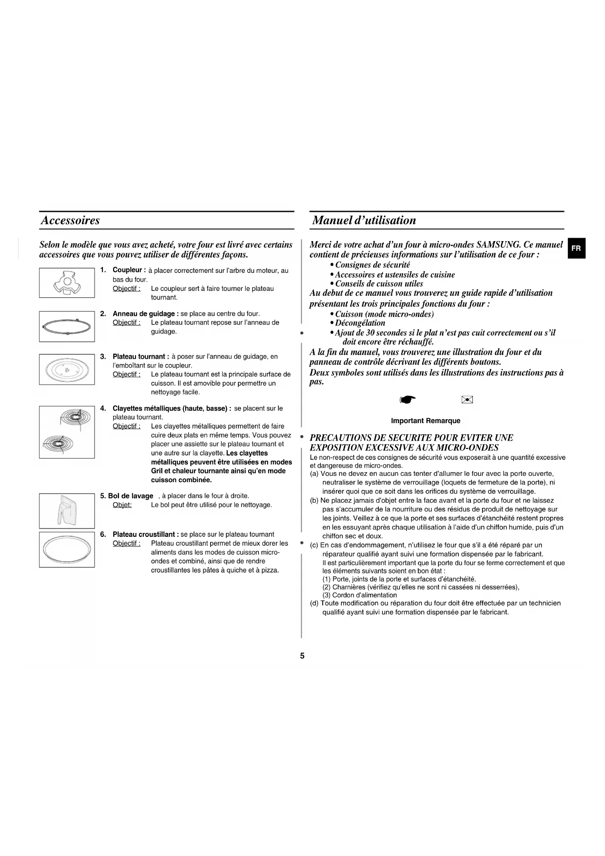 Accessoires Selon le modèle que vous avez acheté, votre four est livré avec certains accessoires que vous pouvez utiliser de différentes façons. Manuel d’utilisation Merci de votre achat d’un four à micro-ondes SAMSUNG. Ce manuel contient de précieuses informations sur l’utilisation de ce four :