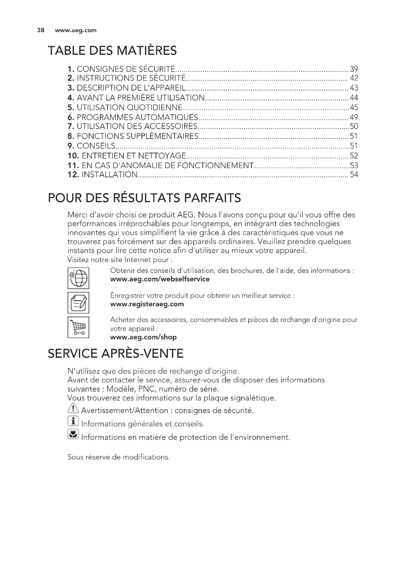 Merci d'avoir choisi ce produit AEG. Nous l'avons conçu pour qu'il vous offre des performances irréprochables pour longtemps, en intégrant des technologies innovantes qui vous simplifient la vie grâce à des caractéristiques que vous ne trouverez pas forcément sur des appareils ordinaires. Veuillez prendre quelques instants pour lire cette notice afin d'utiliser au mieux votre appareil. Visitez notre site Internet pour : Obtenir des conseils d'utilisation, des brochures, de l'aide, des informations : www.aeg.com/webselfservice Enregistrer votre produit pour obtenir un meilleur service : www.registeraeg.com Acheter des accessoires, consommables et pièces de rechange d'origine pour votre appareil : www.aeg.com/shop