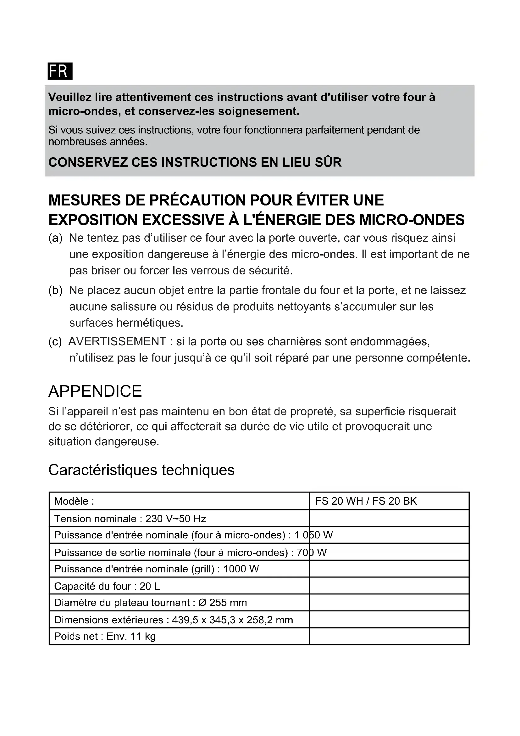 (a) Ne tentez pas d’utiliser ce four avec la porte ouverte, car vous risquez ainsi une exposition dangereuse à l’énergie des micro-ondes. Il est important de ne pas briser ou forcer les verrous de sécurité. (b) Ne placez aucun objet entre la partie frontale du four et la porte, et ne laissez aucune salissure ou résidus de produits nettoyants s’accumuler sur les surfaces hermétiques. (c) AVERTISSEMENT : si la porte ou ses charnières sont endommagées, n’utilisez pas le four jusqu’à ce qu’il soit réparé par une personne compétente. APPENDICE Si l’appareil n’est pas maintenu en bon état de propreté, sa supercie risquerait de se détériorer, ce qui affecterait sa durée de vie utile et provoquerait une situation dangereuse. Caractéristiques techniques Modèle : FS 20 WH / FS 20 BK Tension nominale : 230 V~50 HzPuissance d'entrée nominale (four à micro-ondes) : 1 050 WPuissance de sortie nominale (four à micro-ondes) : 700 WPuissance d'entrée nominale (grill) : 1000 WCapacité du four : 20 LDiamètre du plateau tournant : Ø 255 mmDimensions extérieures : 439,5 x 345,3 x 258,2 mmPoids net : Env. 11 kgINSTRUCTIONS IMPORTANTES DE SÉCURITÉ AVERTISSEMENT Pour réduire le risque d’incendie, de décharge électrique, de dommages aux personnes ou d’exposition excessive aux micro-ondes du four pendant son utilisation, veuillez suivre les précautions de base ci-dessous :