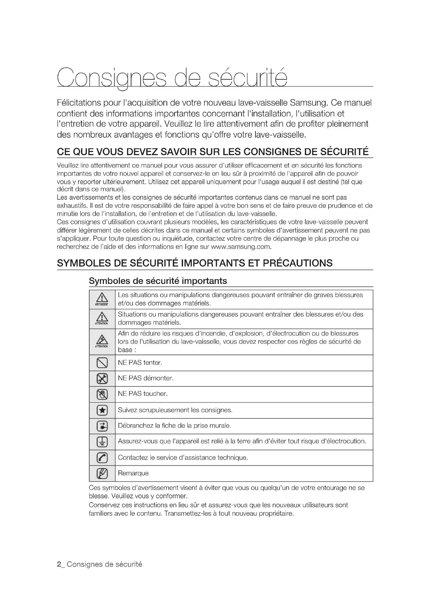 Detects whether the door of the dishwasher is open or closed if the door is open while the dishwasher is running the cycle is temporary stopped. DW5000H_DD81-01651B-08_EN (Morocco).indd 50DW5000H_DD81-01651B-08_EN (Morocco).indd 50 2015-12-08 12:46:022015-12-08 12:46:02Note DW5000H_DD81-01651B-08_EN (Morocco).indd 51DW5000H_DD81-01651B-08_EN (Morocco).indd 51 2015-12-08 12:46:022015-12-08 12:46:02QUESTIONS OR COMMENTS COUNTRY CALL OR VISIT US ONLINE AT MOROCCO 080 100 22 55 www.samsung.com/n_africa/support DD81-01651B-08 DW5000H_DD81-01651B-08_EN (Morocco).indd 52DW5000H_DD81-01651B-08_EN (Morocco).indd 52 2015-12-08 12:46:022015-12-08 12:46:02DW60H3010FV DW60H3010FW DW60H5050FW DW60H5050FS DW60H6050FW DW60H6050FS Lave-vaisselle manuel d'utilisation Un monde de possibilités Nous vous remercions d'avoir choisi ce produit Samsung. DW5000H_DD81-01651B-08_FR (Morocco).indd 1DW5000H_DD81-01651B-08_FR (Morocco).indd 1 2015-12-08 12:46:352015-12-08 12:46:352_ Consignes de sécurité Consignes de sécurité Félicitations pour l'acquisition de votre nouveau lave-vaisselle Samsung. Ce manuel contient des informations importantes concernant l'installation, l'utilisation et l'entretien de votre appareil. Veuillez le lire attentivement afin de profiter pleinement des nombreux avantages et fonctions qu'ore votre lave-vaisselle. CE QUE VOUS DEVEZ SAVOIR SUR LES CONSIGNES DE SÉCURITÉ Veuillez lire attentivement ce manuel pour vous assurer d'utiliser ecacement et en sécurité les fonctions importantes de votre nouvel appareil et conservez-le en lieu sûr à proximité de l'appareil afin de pouvoir vous y reporter ultérieurement. Utilisez cet appareil uniquement pour l'usage auquel il est destiné (tel que décrit dans ce manuel). Les avertissements et les consignes de sécurité importantes contenus dans ce manuel ne sont pas exhaustifs. Il est de votre responsabilité de faire appel à votre bon sens et de faire preuve de prudence et de minutie lors de l'installation, de l'entretien et de l'utilisation du lave-vaisselle. Ces consignes d'utilisation couvrant plusieurs modèles, les caractéristiques de votre lave-vaisselle peuvent diérer légèrement de celles décrites dans ce manuel et certains symboles d'avertissement peuvent ne pas s'appliquer. Pour toute question ou inquiétude, contactez votre centre de dépannage le plus proche ou recherchez de l'aide et des informations en ligne sur www.samsung.com. SYMBOLES DE SÉCURITÉ IMPORTANTS ET PRÉCAUTIONS Symboles de sécurité importants AVERTISSEMENT Les situations ou manipulations dangereuses pouvant entraîner de graves blessures et/ou des dommages matériels. ATTENTION Situations ou manipulations dangereuses pouvant entraîner des blessures et/ou des dommages matériels. ATTENTION Afin de réduire les risques d'incendie, d'explosion, d'électrocution ou de blessures lors de l'utilisation du lave-vaisselle, vous devez respecter ces règles de sécurité de base : NE PAS tenter. NE PAS démonter. NE PAS toucher. Suivez scrupuleusement les consignes. Débranchez la fiche de la prise murale. Assurez-vous que l'appareil est relié à la terre afin d'éviter tout risque d'électrocution. Contactez le service d'assistance technique. Remarque Ces symboles d'avertissement visent à éviter que vous ou quelqu'un de votre entourage ne se blesse. Veuillez vous y conformer. Conservez ces instructions en lieu sûr et assurez-vous que les nouveaux utilisateurs sont familiers avec le contenu. Transmettez-les à tout nouveau propriétaire. DW5000H_DD81-01651B-08_FR (Morocco).indd 2DW5000H_DD81-01651B-08_FR (Morocco).indd 2 2015-12-08 12:46:382015-12-08 12:46:38Consignes de sécurité _3 Afin de réduire les risques d'incendie, d'électrocution ou de blessures lors de l'utilisation de l'appareil, respectez les règles de sécurité de base suivantes :
