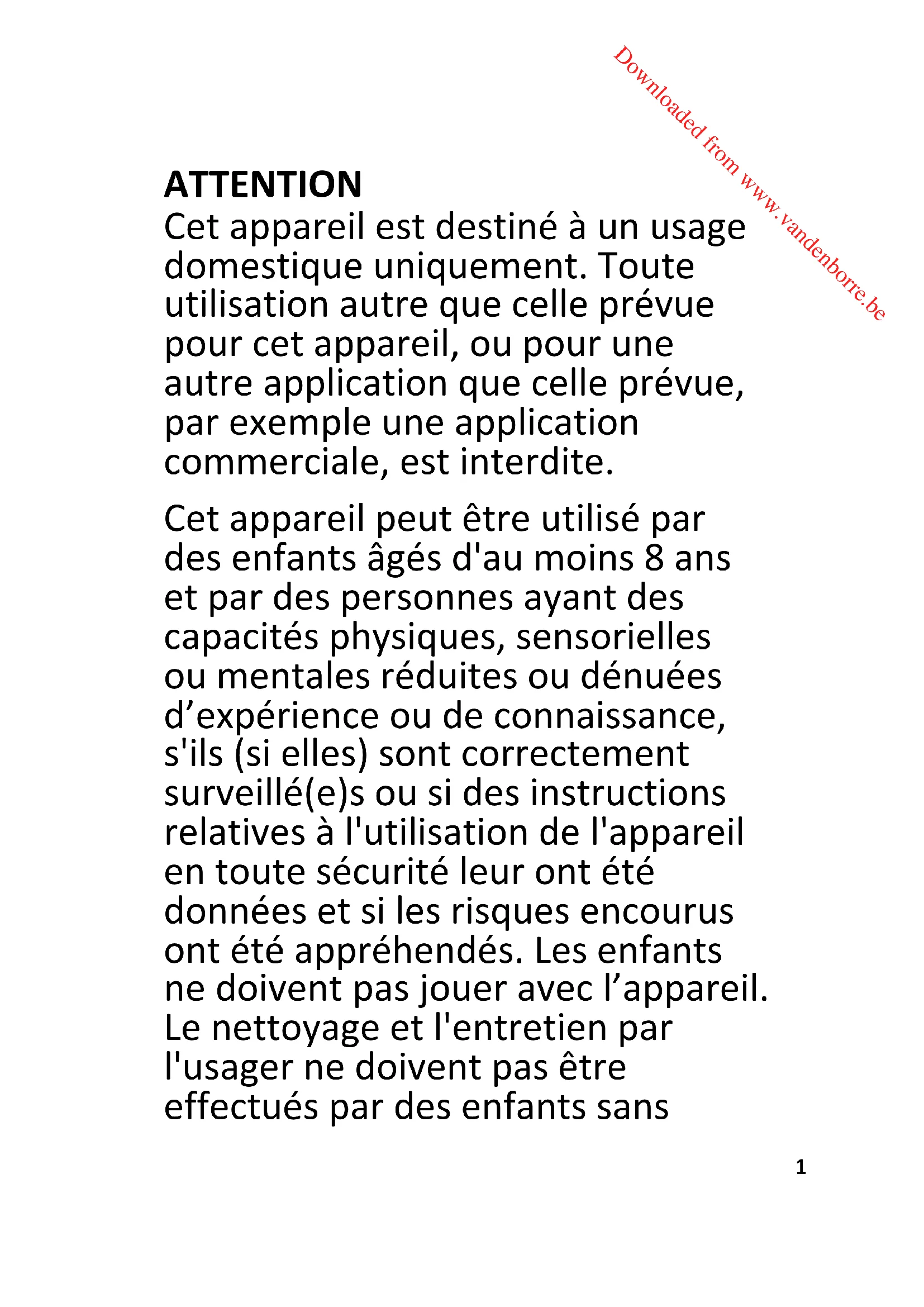 Downloaded from www.vandenborre.beATTENTION Cet appareil est destiné à un usage domestique uniquement. Toute utilisation autre que celle prévue pour cet appareil, ou pour une autre application que celle prévue, par exemple une application commerciale, est interdite. Cet appareil peut être utilisé par des enfants âgés d'au moins 8 ans et par des personnes ayant des capacités physiques, sensorielles ou mentales réduites ou dénuées d’expérience ou de connaissance, s'ils (si elles) sont correctement surveillé(e)s ou si des instructions relatives à l'utilisation de l'appareil en toute sécurité leur ont été données et si les risques encourus ont été appréhendés. Les enfants ne doivent pas jouer avec l’appareil. Le nettoyage et l'entretien par l'usager ne doivent pas être effectués par des enfants sans