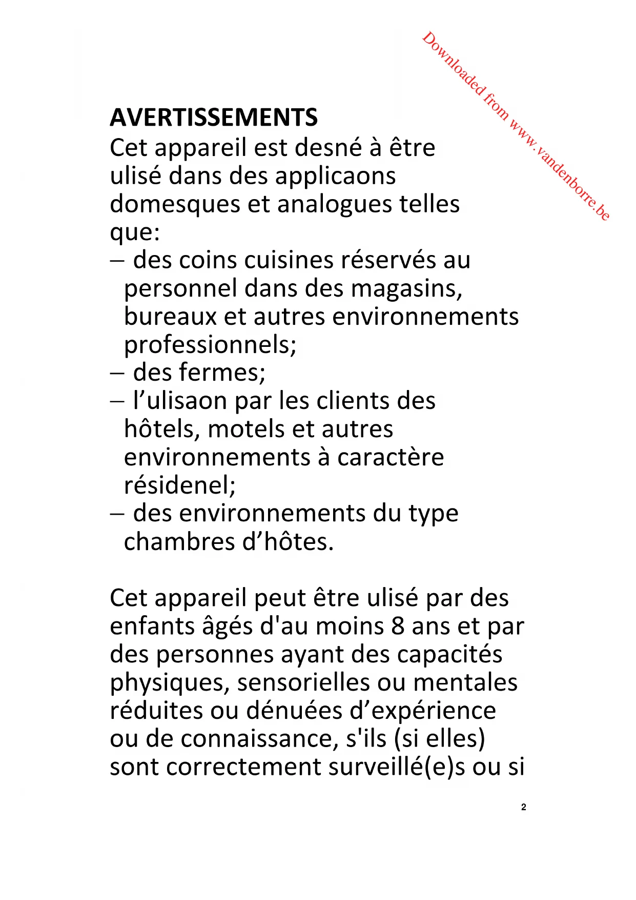 Downloaded from www.vandenborre.be2 AVERTISSEMENTS Cet appareil est destiné à être utilisé dans des applications domestiques et analogues telles que: des coins cuisines réservés au personnel dans des magasins, bureaux et autres environnements professionnels; des fermes; l’utilisation par les clients des hôtels, motels et autres environnements à caractère résidentiel; des environnements du type chambres d’hôtes. Cet appareil peut être utilisé par des enfants âgés d'au moins 8 ans et par des personnes ayant des capacités physiques, sensorielles ou mentales réduites ou dénuées d’expérience ou de connaissance, s'ils (si elles) sont correctement surveillé(e)s ou si Downloaded from www.vandenborre.be3 des instructions relatives à l'utilisation de l'appareil en toute sécurité leur ont été données et si les risques encourus ont été appréhendés. Les enfants ne doivent pas jouer avec l’appareil. Le nettoyage et l'entretien par l'usager ne doivent pas être effectués par des enfants sans surveillance. Si le câble d'alimentation est endommagé, il doit être remplacé par le fabricant, son service après vente ou des personnes de qualification similaire afin d'éviter un danger. Les détails concernant la méthode et la fréquence du nettoyage sont définis en page 20&21 dans la section de “NETTOYAGE ET ENTRETIEN”. Il convient que la porte ne soit pas laissée en position ouverte dans la Downloaded from www.vandenborre.be4 mesure où cela pourrait présenter un danger de basculement. MISE EN GARDE: Les couteaux et les autres ustensiles pointus doivent être placés dans le panier pointe vers le bas ou en position horizontale. Les ensembles de raccordement neufs fournis avec l'appareil doivent être utilisés; il convient de ne pas réutiliser les ensembles de raccordement usagés. Les informations sur la façon de charger le lave-vaisselle sont définies en pages 11&13 dans la section “CHARGEMENT DES PANIERS”. La pression minimale admissible pour l’arrivée d’eau est de 0.04 MPa. La pression maximale admissible Downloaded from www.vandenborre.be5 pour l’arrivée d’eau est de 1 MPa. La fiche de prise de courant doit demeurer facilement accessible après l'installation de l'appareil. Le nombre maximal de couverts à laver par ce lave-vaisselle est de 10 couverts.