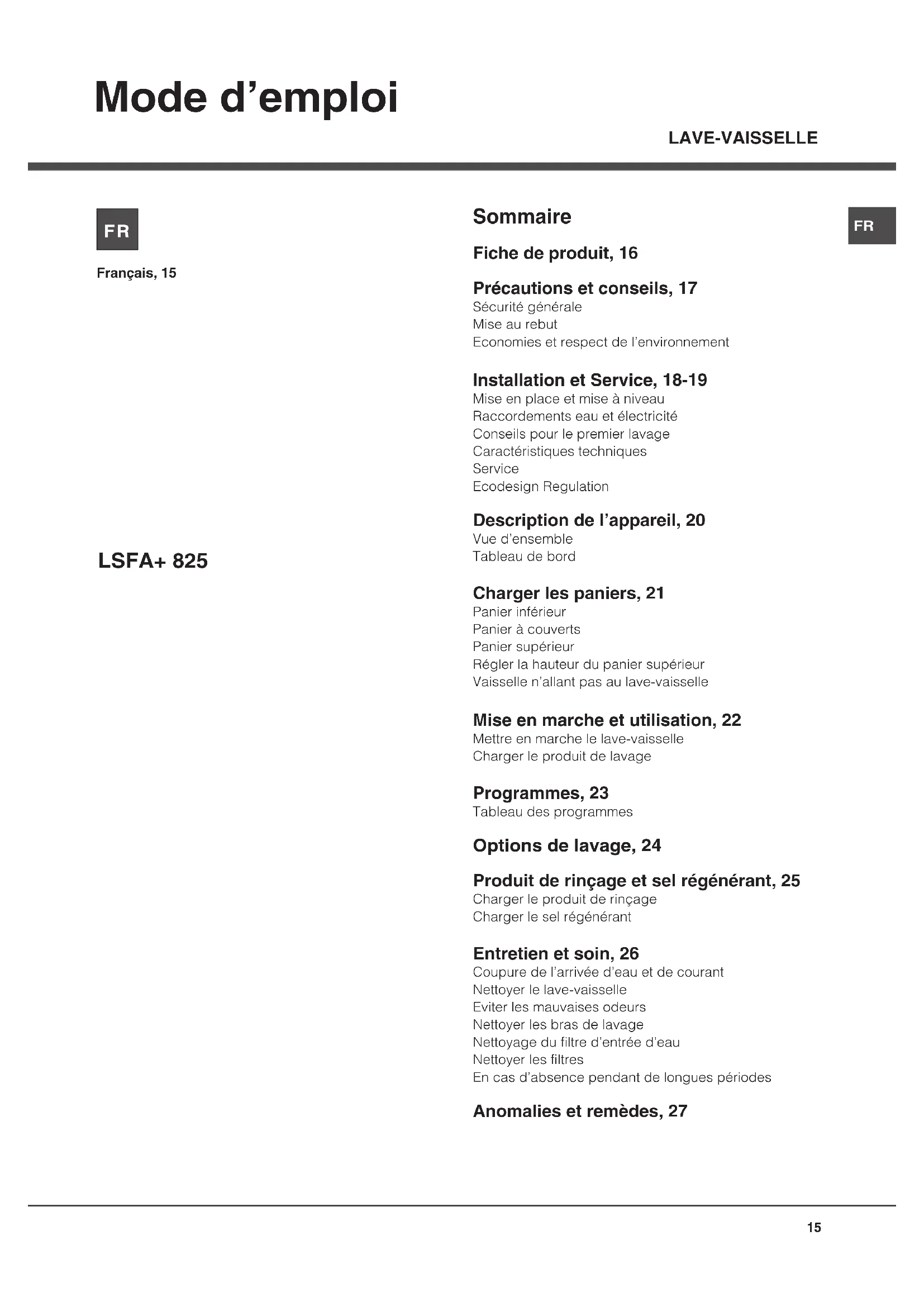 LSFA+ 825 XHA - Lave-vaisselle HOTPOINT ARISTON - Notice d'utilisation et mode d'emploi gratuit