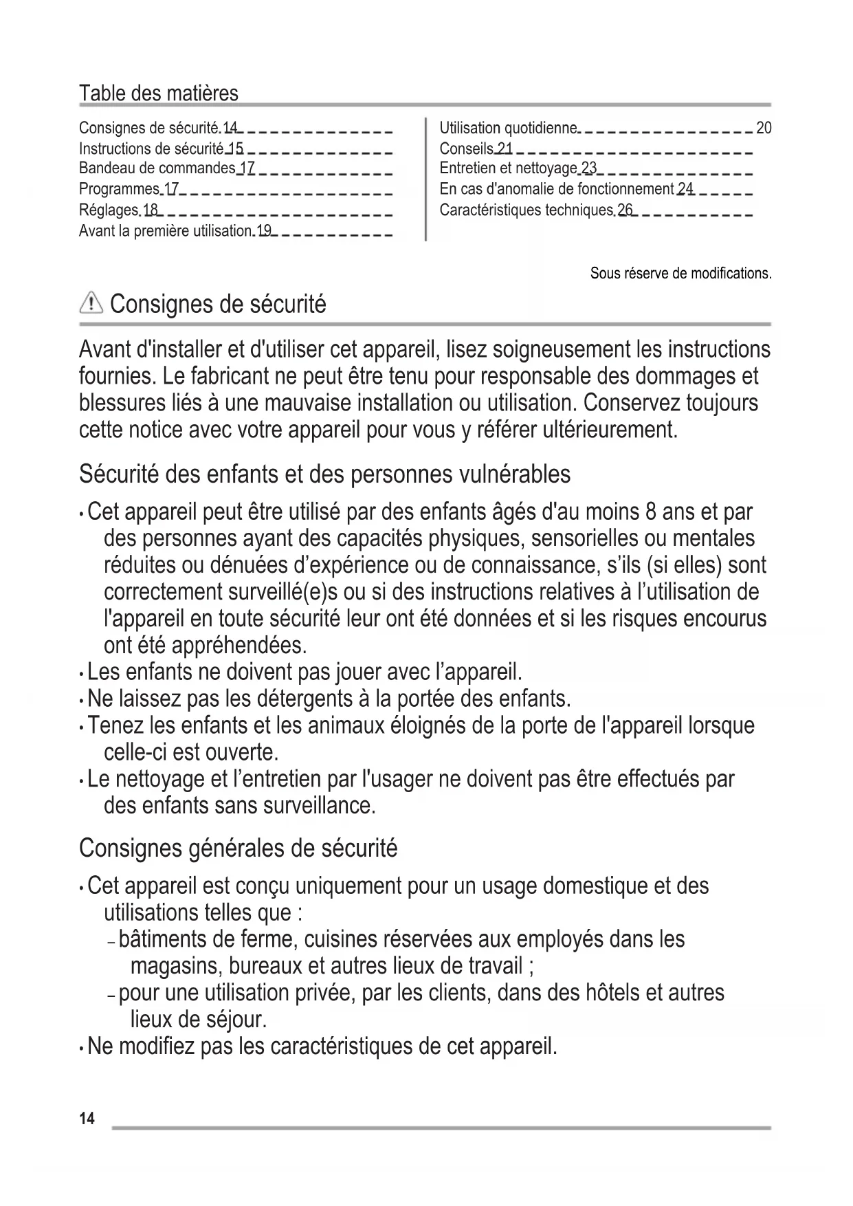 Conseils 21 Entretien et nettoyage 23 En cas d'anomalie de fonctionnement 24 Caractéristiques techniques 26 Sous réserve de modifications. Consignes de sécurité Avant d'installer et d'utiliser cet appareil, lisez soigneusement les instructions fournies. Le fabricant ne peut être tenu pour responsable des dommages et blessures liés à une mauvaise installation ou utilisation. Conservez toujours cette notice avec votre appareil pour vous y référer ultérieurement. Sécurité des enfants et des personnes vulnérables
