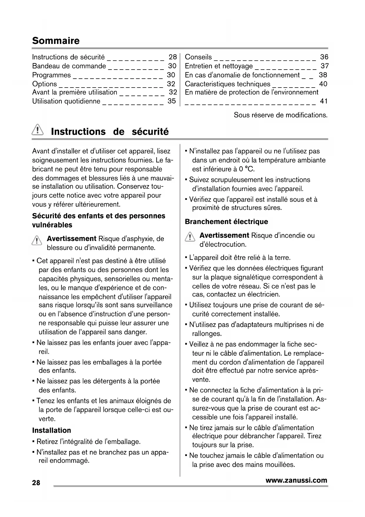 www.zanussi.comSommaire Instructions de sécurité _ _ _ _ _ _ _ _ _ _ 28 Bandeau de commande _ _ _ _ _ _ _ _ _ _ 30 Programmes _ _ _ _ _ _ _ _ _ _ _ _ _ _ _ _ 30 Options _ _ _ _ _ _ _ _ _ _ _ _ _ _ _ _ _ _ _ 32 Avant la première utilisation _ _ _ _ _ _ _ _ 32 Utilisation quotidienne _ _ _ _ _ _ _ _ _ _ _ 35 Conseils _ _ _ _ _ _ _ _ _ _ _ _ _ _ _ _ _ _ 36 Entretien et nettoyage _ _ _ _ _ _ _ _ _ _ _ 37 En cas d'anomalie de fonctionnement _ _ 38 Caracteristiques techniques _ _ _ _ _ _ _ _ 40 En matière de protection de l'environnement _ _ _ _ _ _ _ _ _ _ _ _ _ _ _ _ _ _ _ _ _ _ _ 41 Sous réserve de modifications. Instructions de sécurité Avant d'installer et d'utiliser cet appareil, lisez soigneusement les instructions fournies. Le fa- bricant ne peut être tenu pour responsable des dommages et blessures liés à une mauvai- se installation ou utilisation. Conservez tou- jours cette notice avec votre appareil pour vous y référer ultérieurement. Sécurité des enfants et des personnes vulnérables Avertissement Risque d'asphyxie, de blessure ou d'invalidité permanente.