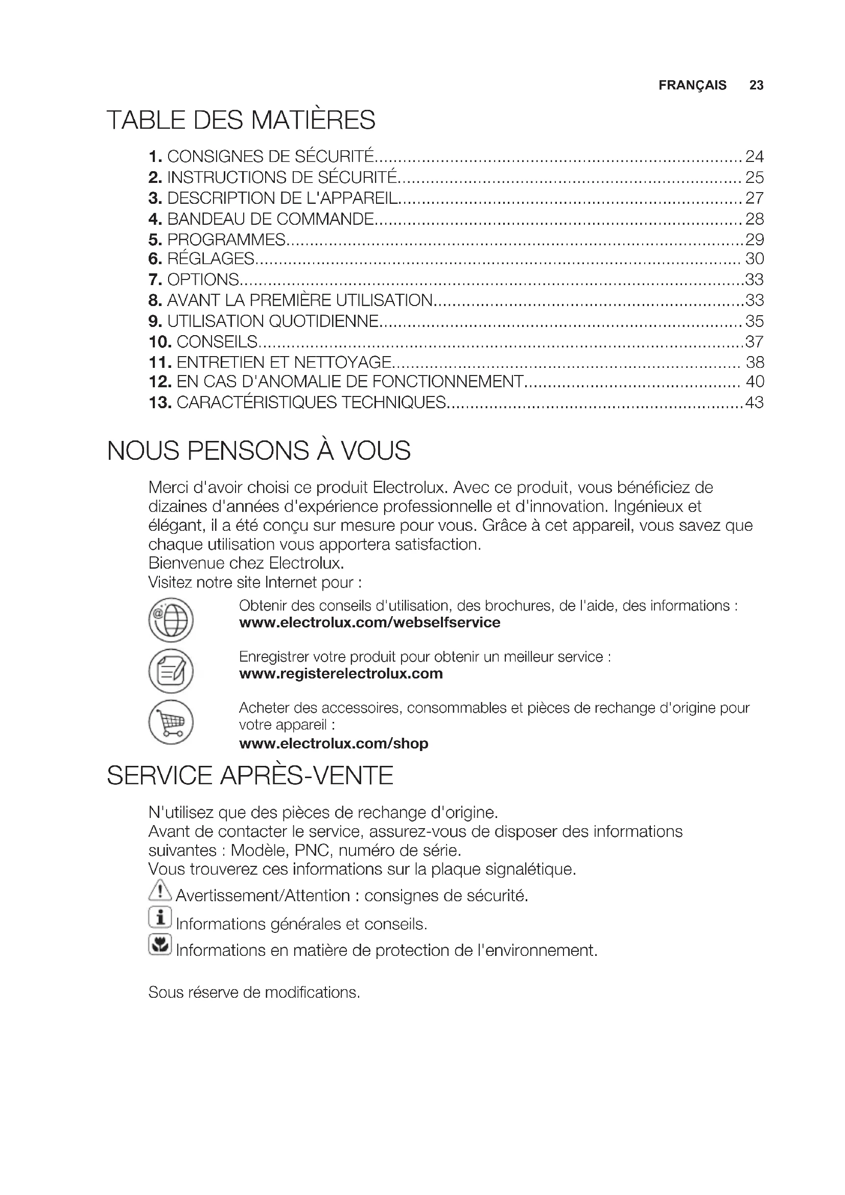 N'utilisez que des pièces de rechange d'origine. Avant de contacter le service, assurez-vous de disposer des informations suivantes : Modèle, PNC, numéro de série. Vous trouverez ces informations sur la plaque signalétique. Avertissement/Attention : consignes de sécurité. Informations générales et conseils. Informations en matière de protection de l'environnement. Sous réserve de modifications. FRANÇAIS
