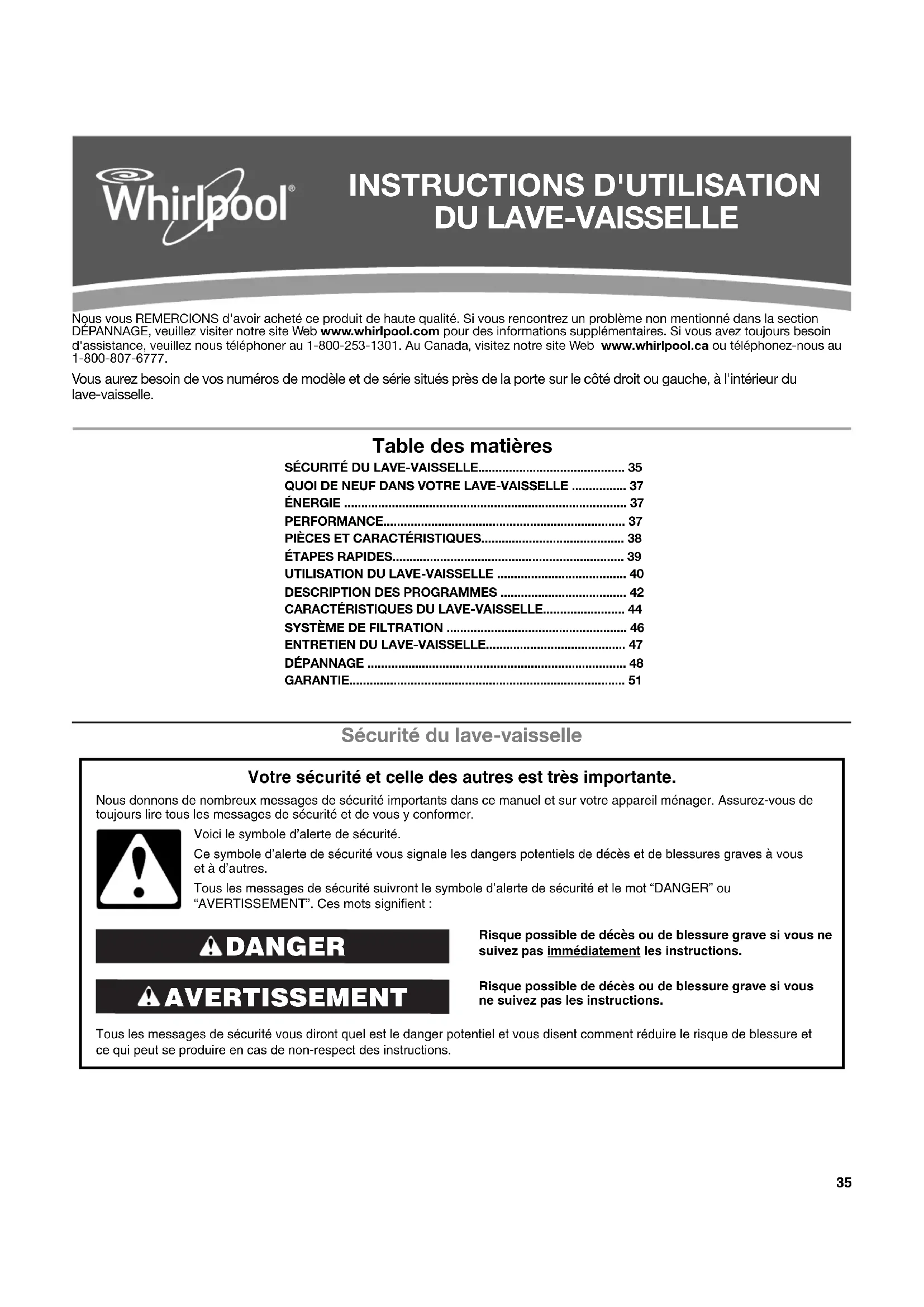 Nous vous REMERCIONS d'avoir acheté ce produit de haute qualité. Si vous rencontrez un problème non mentionné dans la section DEPANNAGE, veuillez visiter notre site Web www.whirlpool.com pour des informations supplémentaires. Si vous avez toujours besoin d'assistance, veuillez nous téléphoner au 1-800-253-1301. Au Canada, visitez notre site Web www.whirlpool.ca ou téléphonez-nous au 1-800-807-6777.
