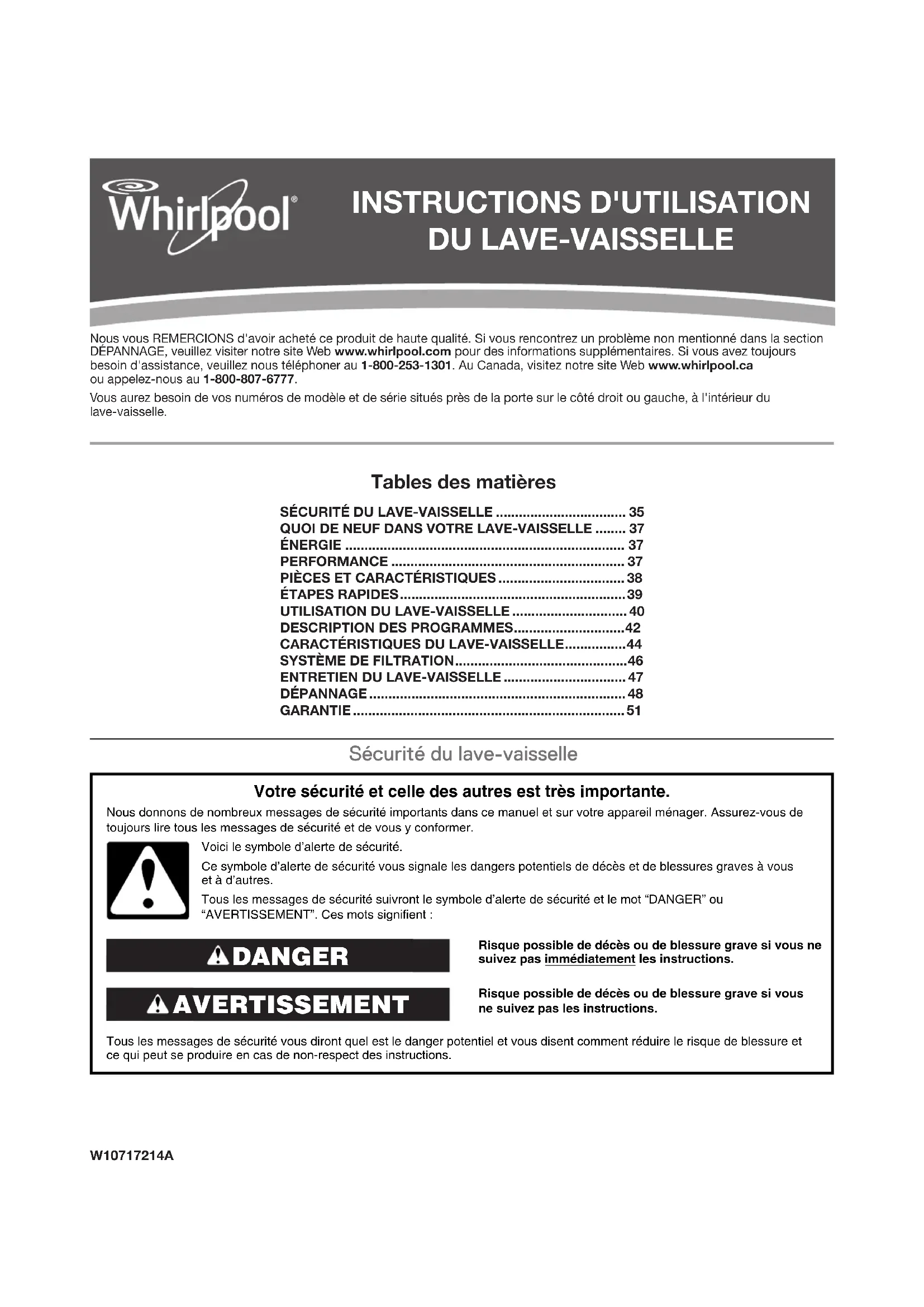 - pièce numéro W10282479. ■ Charger le lave-vaisselle (de préférence avec la vaisselle recouverte d'une pellicule ou précédemment lavée avec une eau dure). ■ Placer une pastille dans le compartiment de lavage principal du distributeur de détergent. ■ Sélectionner le programme/l'option le/la mieux adapté(e) à une vaisselle très sale et mettre en marche le lave-vaisselle. REMARQUE : L'utilisation d'une pastille ou d'un sachet prémesuré de détergent est recommandée pour une utilisation quotidienne ordinaire. Dispositif anti-refoulement Inspecter et nettoyer le dispositif anti-refoulement, le cas échéant, si le lave- vaisselle ne se vidange pas correctement. Pour réduire le risque de dommages matériels durant les vacances ou une période d'inutilisation prolongée ■ Si l’on n’utilise pas le lave-vaisselle pendant l’été, couper l’arrivée d’eau et l’alimentation électrique du lave-vaisselle. ■ S’assurer que les tuyaux d’alimentation en eau sont protégés contre le gel. La formation de glace dans les canalisations d’arrivée d’eau peut entraîner une élévation de la pression en eau et endommager le lave-vaisselle ou le domicile. La garantie de l’appareil ne couvre pas les dommages imputables au gel. ■ Lors du remisage du lave-vaisselle pendant l’hiver, éviter tout dommage lié à l’eau en faisant hivériser le lave-vaisselle par un dépanneur agréé.48 Dépannage Essayez d'abord les solutions suggérées ici. Pour obtenir de l'aide ou des conseils qui permettront peut-être d'éviter une intervention de dépannage, consultez la page de garantie de ce manuel et balayez le code avec votre appareil intelligent, ou consultez le site internet www.whirlpool.com/product_help ou www.whirlpool.ca. Vous pouvez adresser tous commentaires ou questions par courrier à l'adresse ci-dessous : Aux États-Unis : Whirlpool Brand Home Appliances Customer eXperience Center 553 Benson Road Benton Harbor, MI 49022-2692 Au Canada : Whirlpool Brand Home Appliances Customer eXperience Centre 200 – 6750 Century Ave. Mississauga, Ontario L5N 0B7 Dans votre correspondance, veuillez indiquer un numéro de téléphone où l'on peut vous joindre dans la journée. Le lave-vaisselle ne fonctionne pas correctement ■ Le lave-vaisselle ne fonctionne pas ou s’arrête au cours d’un programme Il est normal pour certains programmes de faire des pauses répétées de quelques secondes au cours du lavage principal. La porte est-elle bien fermée et verrouillée? A-t-on sélectionné le bon programme? Le lave-vaisselle est-il alimenté par le courant électrique? Un fusible du domicile est-il grillé ou le disjoncteur s’est-il déclenché? Remplacer le fusible ou réenclencher le disjoncteur. Si le problème persiste, appeler un électricien. Le moteur s’est-il arrêté par suite d’une surcharge? Le moteur se réactive automatiquement après quelques minutes. S’il ne se remet pas en marche, contacter le service de dépannage. Le robinet d’arrêt (le cas échéant) est-il ouvert? ■ Le témoin Clean (propre) clignote Vérier ce qui suit : ■ Le dispositif de protection contre le débordement peut-il monter et descendre librement? Appuyer pour le libérer. ■ Vérier que le robinet d'eau d'alimentation du lave- vaisselle est ouvert. (Ceci est très important si l'installation du lave-vaisselle est récente). ■ Vérier l'absence de mousse dans le lave-vaisselle. Si le système de détection du lave-vaisselle détecte la présence de mousse, il est possible que le lave-vaisselle ne fonctionne pas correctement ou ne se remplisse pas d'eau. La mousse peut provenir de :
