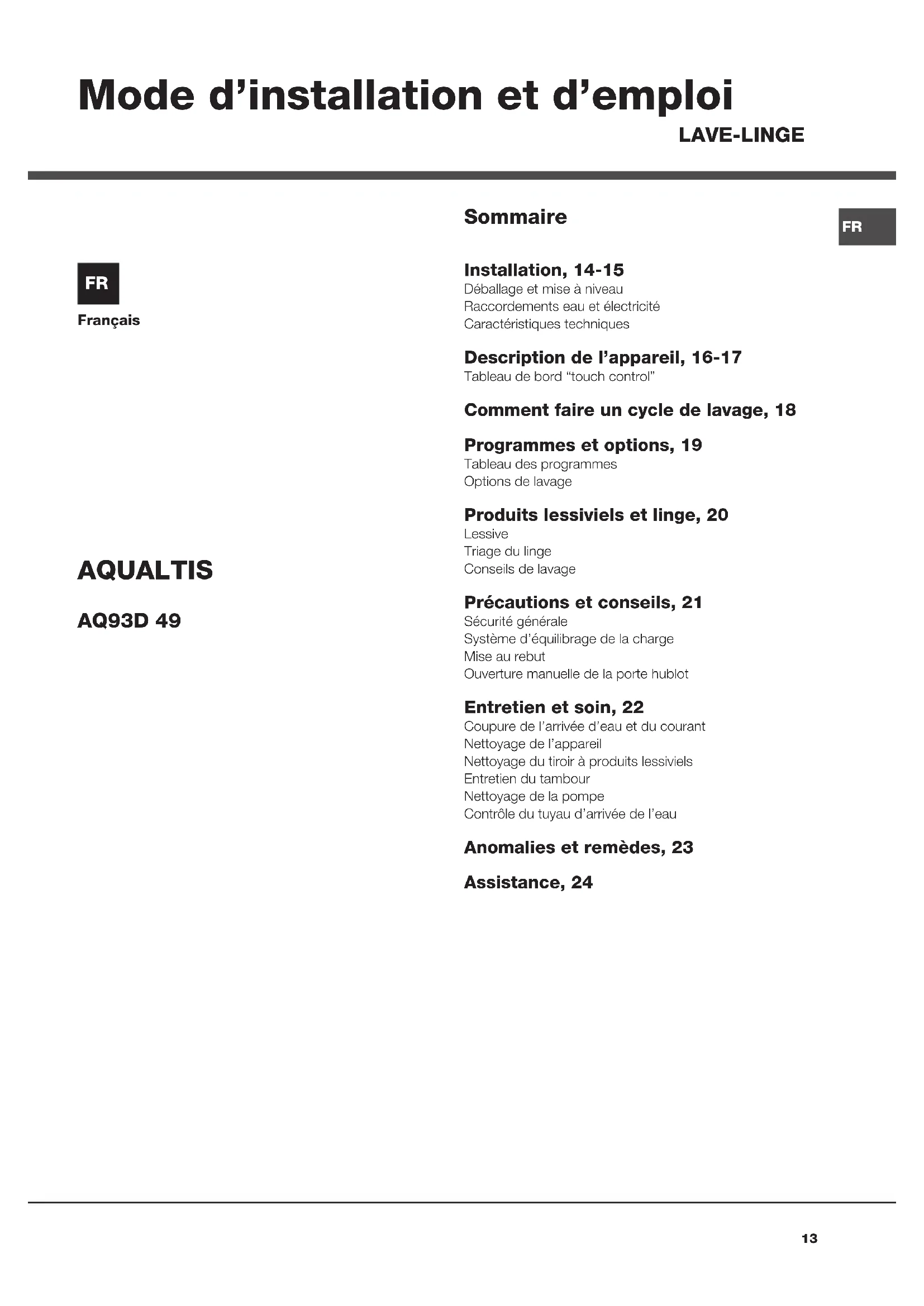 Français Sommaire Installation, 14-15 Déballage et mise à niveauRaccordements eau et électricitéCaractéristiques techniques Description de l’appareil, 16-17 Tableau de bord “touch control” Comment faire un cycle de lavage, 18 Programmes et options, 19 Tableau des programmesOptions de lavage Produits lessiviels et linge, 20 LessiveTriage du lingeConseils de lavage Précautions et conseils, 21 Sécurité générale Système d’équilibrage de la chargeMise au rebutOuverture manuelle de la porte hublot Entretien et soin, 22 Coupure de l’arrivée d’eau et du courantNettoyage de l’appareilNettoyage du tiroir à produits lessivielsEntretien du tambourNettoyage de la pompeContrôle du tuyau d’arrivée de l’eau Anomalies et remèdes, 23 Assistance, 24