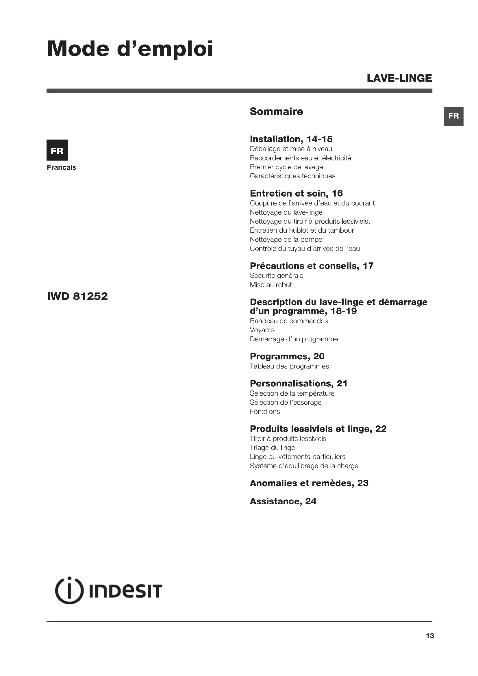 Français Sommaire Installation, 14-15 Déballage et mise à niveau Raccordements eau et électricité Premier cycle de lavage Caractéristiques techniques Entretien et soin, 16 Coupure de l’arrivée d’eau et du courant Nettoyage du lave-linge Nettoyage du tiroir à produits lessiviels. Entretien du hublot et du tambour Nettoyage de la pompe Contrôle du tuyau d’arrivée de l’eau Précautions et conseils, 17 Sécurité générale Mise au rebut Description du lave-linge et démarrage d’un programme, 18-19 Bandeau de commandes Voyants Démarrage d’un programme Programmes, 20 Tableau des programmes Personnalisations, 21 Sélection de la température Sélection de l’essorage Fonctions Produits lessiviels et linge, 22 Tiroir à produits lessiviels Triage du linge Linge ou vêtements particuliers Système d’équilibrage de la charge Anomalies et remèdes, 23 Assistance, 24