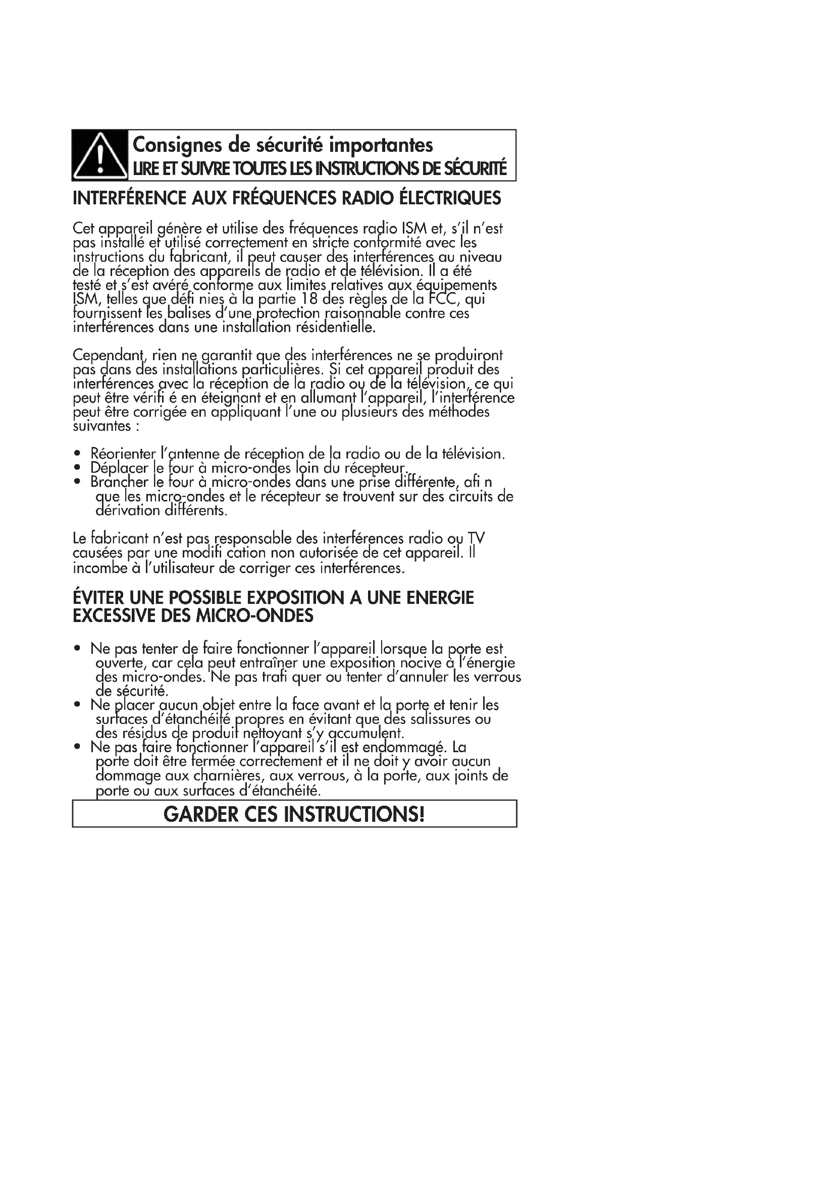 - Brancher le four à micro-ondes dans une prise différente, afi n que les micro-ondes et le récepteur se trouvent sur des circuits de dérivation différents. Le fabricant n’est pas responsable des interférences radio ou TV causées par une modifi cation non autorisée de cet appareil. Il incombe à l’utilisateur de corriger ces interférences. ÉVITER UNE POSSIBLE EXPOSITION A UNE ENERGIE