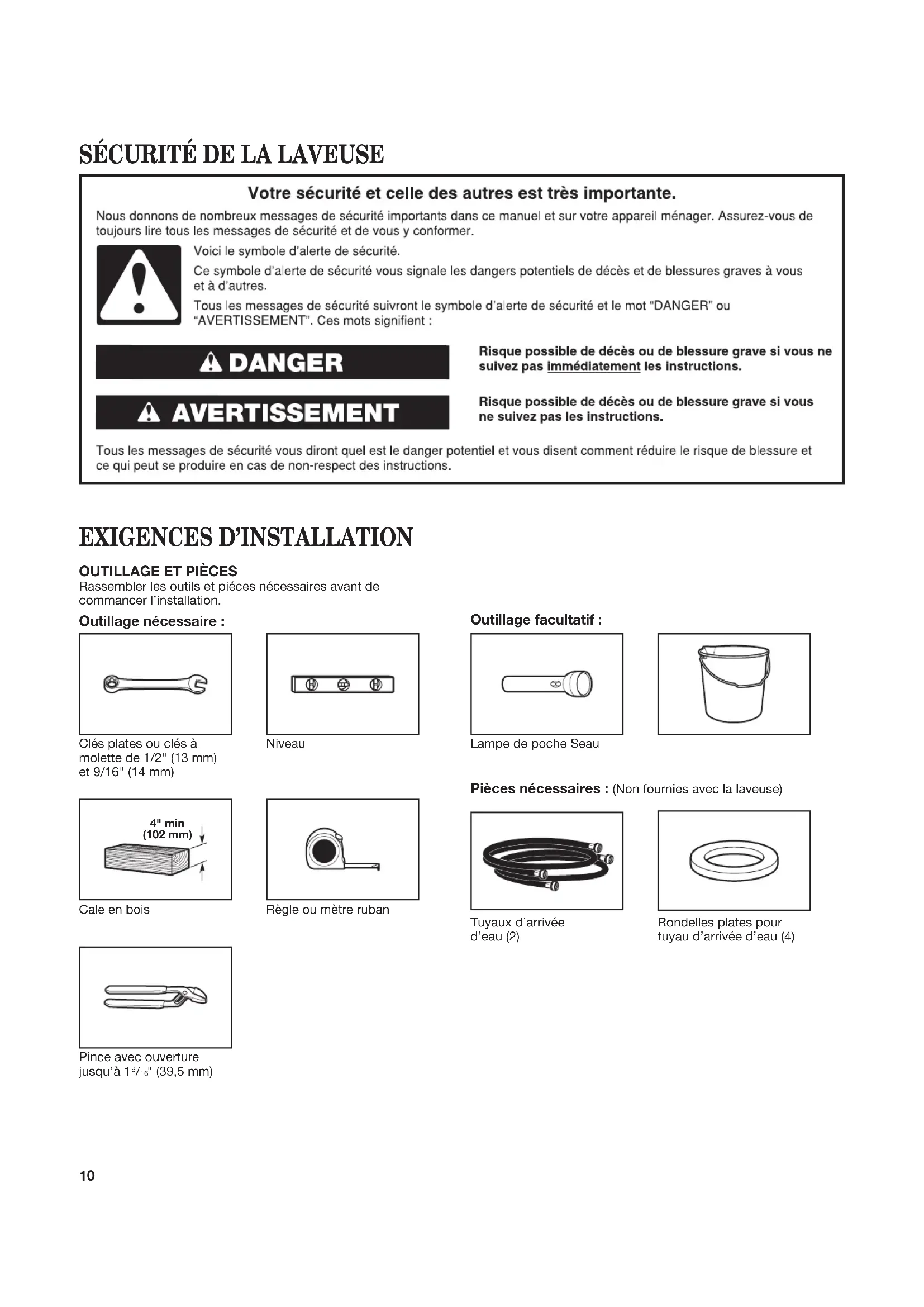 Rassembler les outils et piéces nécessaires avant de commancer l’installation. Pièces nécessaires : (Non fournies avec la laveuse) Tuyaux d’arrivée d’eau (2) Rondelles plates pour tuyau d’arrivée d’eau (4)11 Pièces fournies : REMARQUE : Toutes les pièces fournies pour l’installation se trouvent dans le panier de la laveuse. Attache-câble Tuyau de vidange avec bride et bride de retenue (peuvent être livrés non montés) Bouchons d’obturation de trous de boulons de transport (4) Accessoires disponibles : Vous pouvez obtenir un piédestal facultatif assorti pour la laveuse. Contacter le revendeur pour effectuer la commande ou voir la page “Assistance ou service” au dos du “Guide d’utilisation et d’entretien”. Autres pièces : (Non fournies avec la laveuse) Il se peut que l’installation nécessite des pièces supplémentaires. Pour commander, consulter les numéros d’appel sans frais gurant sur la page de couverture du “Guide d’utilisation et d’entretien”. Si vous avez : Il vous faudra : Un égout surélevé Tuyau de vidange standard de 20 gal. (76 L) de 39" (990 mm) de haut ou évier de décharge, pompe de puisard et connecteurs (disponibles chez les vendeurs de matériel de plomberie locaux) Tuyau de rejet à Adaptateur pour tuyau rigide de rejet l’égout rigide à l’égout rigide de diamètre 2" (51 mm) de 1" (25 mm) à 1" (25 mm) Pièce numéro 3363920 Ensemble de connection, pièce numéro 285835 Un tuyau de vidange Tuyau de vidange supplémentaire, trop court pièce numéro 285863 Ensemble de connection pièce numéro 285835 Le système d’évacuation Protecteur de canalisation, obstrué par de la charpie pièce numéro 367031 Ensemble de connection, pièce numéro 285835 Système de vidange Ensemble de brise-siphon, pièce plancher au numéro 285834 Ensemble de raccordement (2), pièce numéro 285835 Pièce de rallonge du tuyau de vidange, Numéro 285863 Tuyaux d’arrivée d’eau alternatifs : (peuvent être nécessaires pour certaines installations; ne sont pas fournis avec la laveuse)