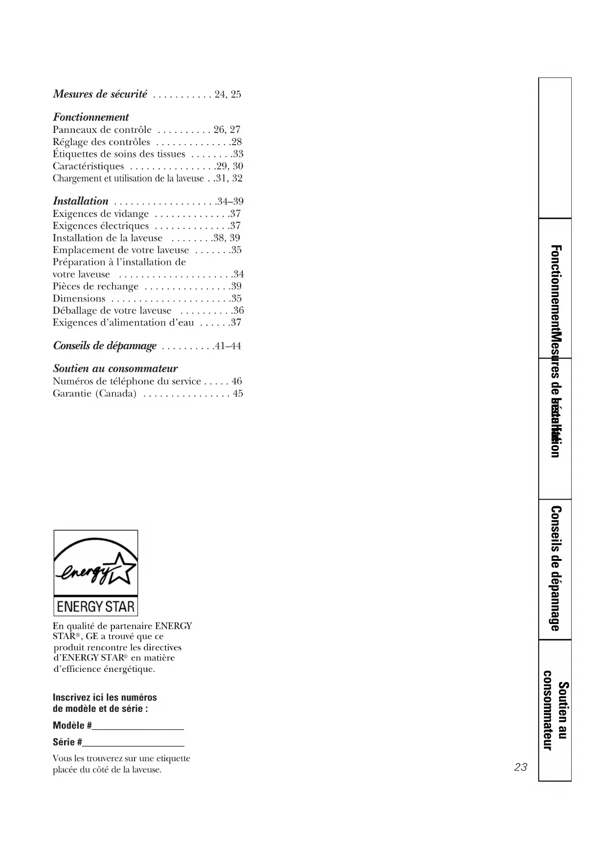 - Garantie (Canada) Inscrivez ici les numéros de modèle et de série : Modèle #__________________ Série #____________________ Vous les trouverez sur une etiquette placée du côté de la laveuse. En qualité de partenaire ENERGY STAR p. 45