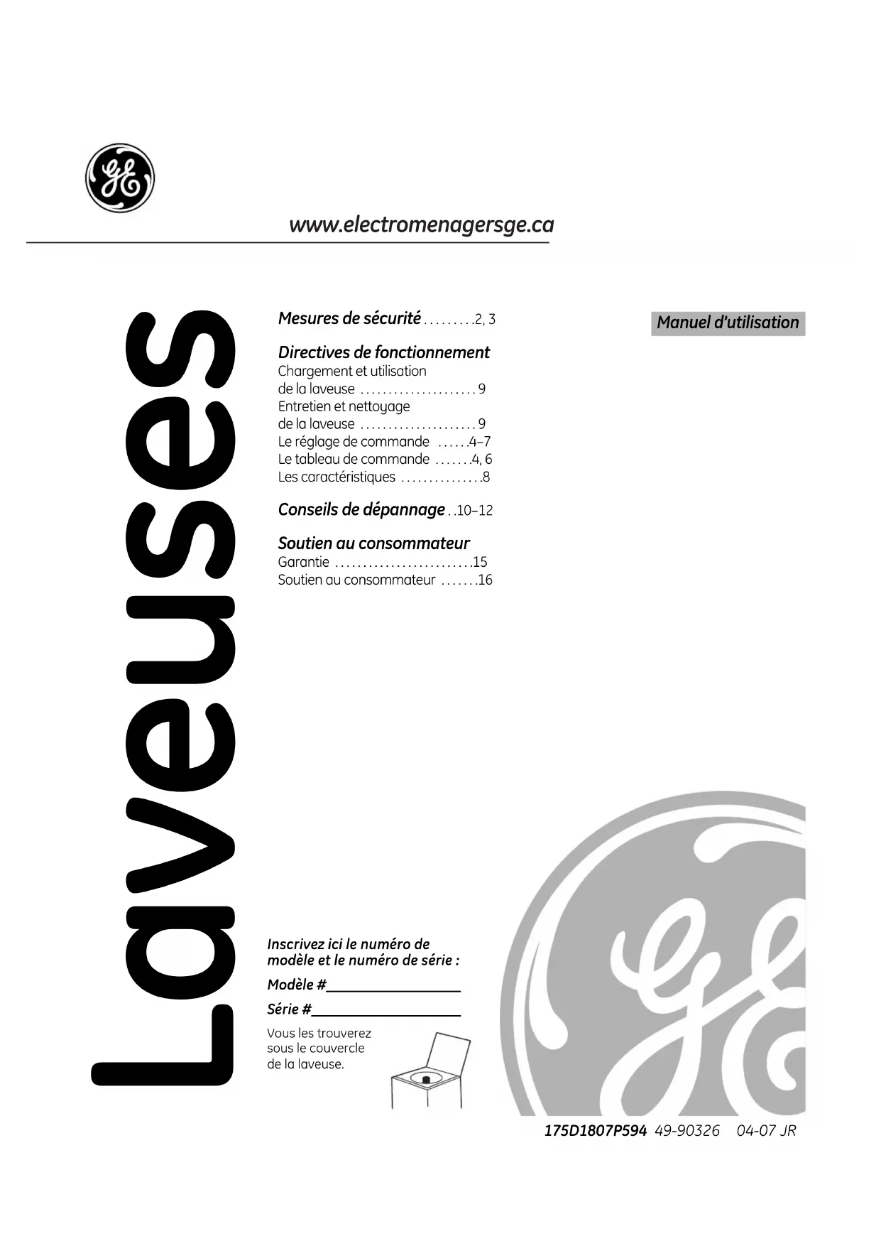 Toutes les réparations sous garantie seront effectuées par nos centres de réparation ou nos réparateurs autorisés. Appelez le 1.800.561.3344. Veuillez fournir le numéro de série et le numéro de modèle lorsque vous appelez pour obtenir le service. Garantie de votre laveuse. ■ Toute visite à votre domicile pour vous expliquer le fonctionnement de l’appareil. Lisez votre Manuel d’utilisation. Pour toute question concernant le fonctionnement de l’appareil, communiquez avec votre marchand ou notre bureau des Relations avec les consommateurs à l’adresse indiquée ci-dessous : Directeur, Relations avec les consommateurs Mabe Canada Inc. 1 Factory Lane, Bureau 310 Moncton, N.B. E1C 9M3 ■ Une installation inadéquate. Si vous avez des questions concernant l’installation, communiquez avec votre marchand ou votre installateur. Il vous incombe de fournir les installations appropriées électriques d’évacuation et autres. ■ Le remplacement des fusibles ou le réenclenchement des disjoncteurs du panneau de distribution. ■ Toute défectuosité du produit lorsqu’il est utilisé de façon abusive, à des fins commerciales ou à toute autre fin que celle pour laquelle il a été conçu. ■ Tout dommage au produit attribuable à un accident, un incendie, une inondation ou un cas de force majeure. ■ Tout dommage au fini non signalé dans les 48 heures qui suivent la livraison de la machine. ■ Le service s’il est impossible d’avoir accès au produit pour ce faire. Ce qui n’est pas couvert : Garant : MABE CANADA INC. LE FABRICANT NE SE TIENT NULLEMENT RESPONSABLE DE TOUT DOMMAGE INDIRECT. EXCLUSION DE GARANTIES IMPLICITES – Votre seul et unique recours est la réparation du produit selon les dispositions de cette Garantie limitée. Toutes les garanties implicites, incluant les garanties de commercialité et d’adéquation à un usage spécifique, sont limitées à une année ou à la période la plus courte autorisée par la législation. Cette garantie est valable pour le premier propriétaire et tout autre propriétaire du produit s’il acheté pour utilisation domestique au Canada. Le service sous garantie sera fourni là où il est disponible et dans les régions que Mabe considère que l’offre de service est raisonnable.Imprimé aux États-Unis Soutien au consommateur. Site Web appareils électroménagers GE www.electromenagersge.ca Vous avez une question ou vous avez besoin d’aide pour votre appareil électroménager? Contactez-nous par Internet au site www.electromenagersge.ca 24 heures par jour, tous les jours de l’année. Service de réparations 1.800.561.3344 Service de réparations GE est tout près de vous. Pour faire réparer votre électroménager GE, il suffit de nous téléphoner. Studio de conception réaliste Sur demande, GE peut fournir une brochure sur l’aménagement d’une cuisine pour les personnes à mobilité réduite. Écrivez : Directeur, Relations avec les consommateurs, Mabe Canada Inc. Bureau 310, 1 Factory Lane Moncton, N.B. E1C 9M3 Prolongation de garantie www.electromenagersge.ca Achetez un contrat d’entretien GE avant que votre garantie n’expire et bénéficiez d’un rabais substantiel. Ainsi le service après-vente GE sera toujours là après expiration de la garantie. Visitez notre site Web ou appelez-nous au 1.800.461.3636. Pièces et accessoires Ceux qui désirent réparer eux-mêmes leurs électroménagers peuvent recevoir pièces et accessoires directement à la maison (cartes VISA, MasterCard et Discover acceptées). Les directives stipulées dans le présent manuel peuvent être effectuées par n’importe quel utilisateur. Les autres réparations doivent généralement être effectuées par un technicien qualifié. Soyez prudent, car une réparation inadéquate peut affecter le fonctionnement sécuritaire de l’appareil. Vous trouverez dans les pages jaunes de votre annuaire le numéro du Centre de service Mabe le plus proche. Autrement, appelez-nous au 1.888.261.3055. Contactez-nous Si vous n’êtes pas satisfait du service après-vente dont vous avez bénéficié : Premièrement, communiquez avec les gens qui ont réparé votre appareil. Ensuite, si vous n’êtes toujours pas satisfait envoyez tous les détails—numéro de téléphone compris—au Directeur, Relations avec les consommateurs, Mabe Canada Inc. Bureau 310, 1 Factory Lane Moncton, N.B. E1C 9M3 Inscrivez votre appareil électroménager www.electromenagersge.ca Inscrivez votre appareil électroménager en direct, aussitôt que possible. Cela améliorera nos communications et notre service après-vente. Vous pouvez également nous envoyer par la poste le formulaire d’inscription joint à votre documentation.