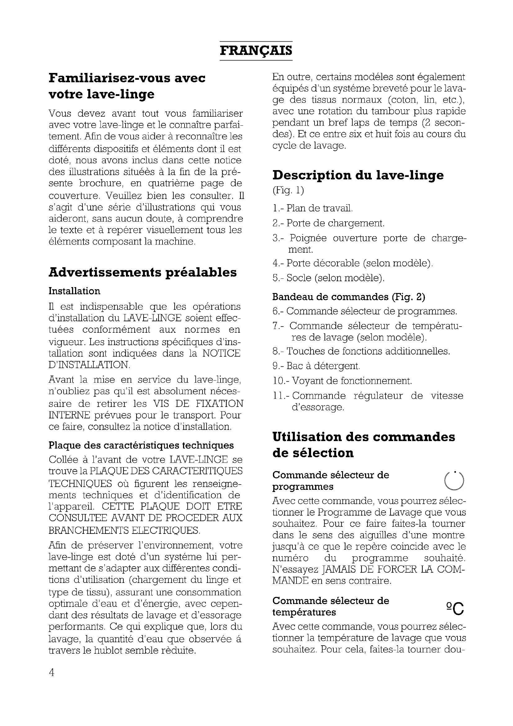 BRANCHEMENTS ELECTRIQUES. Afin de préserver l’environnement, votre lave-linge est doté d’un systéme lui per- mettant de s’adapter aux différentes condi- tions d’utilisation (chargement du linge et type de tissu), assurant une consommation optimale d’eau et d’énergie, avec cepen- dant des résultats de lavage et d’essorage performants. Ce qui explique que, lors du lavage, la quantité d’eau que observée á travers le hublot semble rèduite. En outre, certains modéles sont également équipés d’un systéme breveté pour le lava- ge des tissus normaux (coton, lin, etc.), avec une rotation du tambour plus rapide pendant un bref laps de temps (2 secon- des). Et ce entre six et huit fois au cours du cycle de lavage. Description du lave-linge (Fig. 1) 1.- Plan de travail. 2.- Porte de chargement. 3.- Poignée ouverture porte de charge- ment. 4.- Porte décorable (selon modèle). 5.- Socle (selon modèle). Bandeau de commandes (Fig. 2) 6.- Commande sélecteur de programmes. 7.- Commande sélecteur de températu- res de lavage (selon modèle). 8.- Touches de fonctions additionnelles. 9.- Bac à détergent. 10.- Voyant de fonctionnement. 11.- Commande régulateur de vitesse d’essorage. Utilisation des commandes de sélection Commande sélecteur de programmes Avec cette commande, vous pourrez sélec- tionner le Programme de Lavage que vous souhaitez. Pour ce faire faites-la tourner dans le sens des aiguilles d’une montre jusqu’à ce que le repère coincide avec le numéro du programme souhaité. N’essayez JAMAIS DE FORCER LA COM- MANDE en sens contraire. Commande sélecteur de températures Avec cette commande, vous pourrez sélec- tionner la température de lavage que vous souhaitez. Pour cela, faites-la tourner dou-