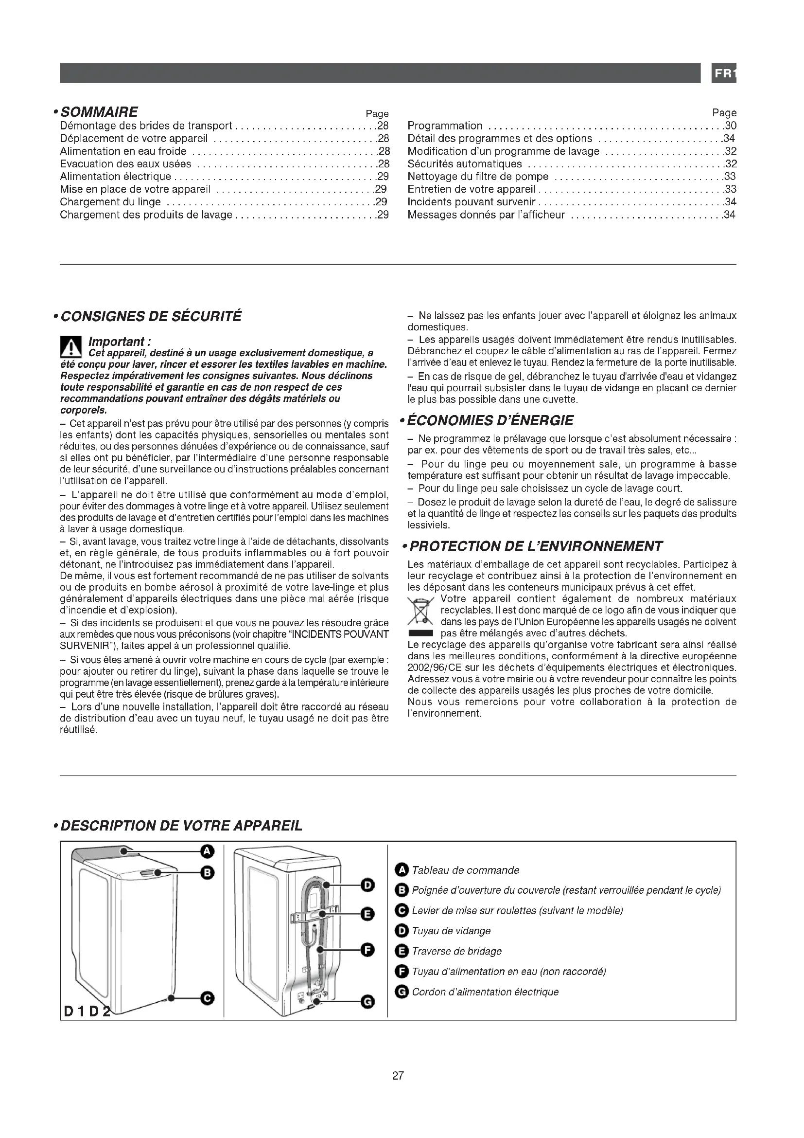 - SOMMAIRE Page Démontage des brides de transport . . . . . . . . . . . . . . . . . . . . . . . . . .28 Déplacement de votre appareil . . . . . . . . . . . . . . . . . . . . . . . . . . . . . .28 Alimentation en eau froide . . . . . . . . . . . . . . . . . . . . . . . . . . . . . . . . . .28 Evacuation des eaux usées . . . . . . . . . . . . . . . . . . . . . . . . . . . . . . . . .28 Alimentation électrique . . . . . . . . . . . . . . . . . . . . . . . . . . . . . . . . . . . . .29 Mise en place de votre appareil . . . . . . . . . . . . . . . . . . . . . . . . . . . . .29 Chargement du linge . . . . . . . . . . . . . . . . . . . . . . . . . . . . . . . . . . . . . .29 Chargement des produits de lavage . . . . . . . . . . . . . . . . . . . . . . . . . .29 Page Programmation . . . . . . . . . . . . . . . . . . . . . . . . . . . . . . . . . . . . . . . . . . .30 Détail des programmes et des options . . . . . . . . . . . . . . . . . . . . . . .34 Modification d’un programme de lavage . . . . . . . . . . . . . . . . . . . . . .32 Sécurités automatiques . . . . . . . . . . . . . . . . . . . . . . . . . . . . . . . . . . . .32 Nettoyage du filtre de pompe . . . . . . . . . . . . . . . . . . . . . . . . . . . . . . .33 Entretien de votre appareil . . . . . . . . . . . . . . . . . . . . . . . . . . . . . . . . . .33 Incidents pouvant survenir . . . . . . . . . . . . . . . . . . . . . . . . . . . . . . . . . .34 Messages donnés par l’afficheur . . . . . . . . . . . . . . . . . . . . . . . . . . . .34