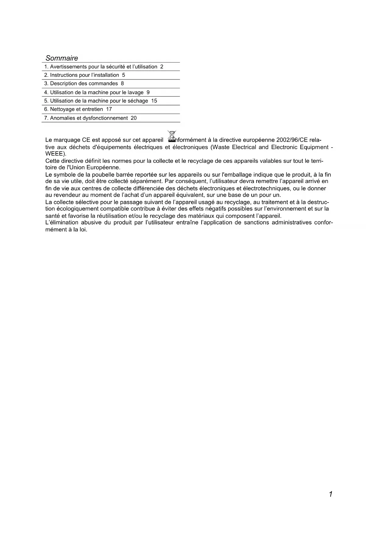 - Ce manuel fait partie intégrante de l’appareil : il faut toujours le conserver en parfait état avec l’appareil. L’installation devra être effectuée par du personnel qualifié et conformément aux nor- mes en vigueur. L’appareil a été conçu pour les fonctions suivantes : lavage et séchage de linge ou de tissus déclarés appropriés par le fabricant au traitement en machine sur la plaquette d'iden- tification. Toute autre utilisation doit être considérée impropre. Le fabricant décline toute res- ponsabilité pour des utilisations différentes de celles indiquées.